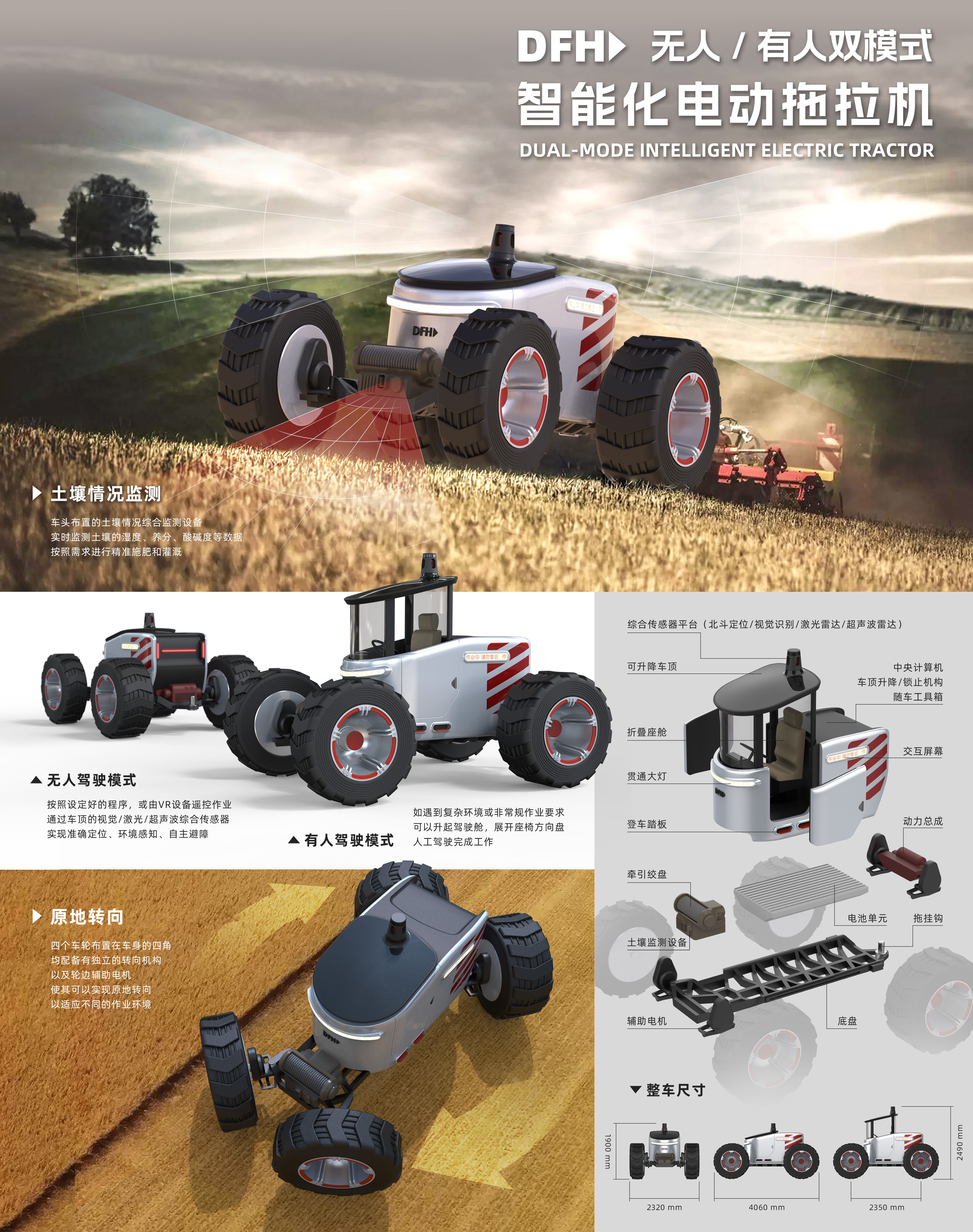 DFH无人/有人双模式智能化电动拖拉机是应用智能驾控技术的农用机械,特点有:①双驾驶模式。DFH可借助车顶综合传感器感知环境,按程序自主作业;面对复杂环境和要求,可升起驾驶舱人工作业。②车头的综合监测设备实时记录土壤湿度、养分、酸碱度等,按需施肥灌溉,实现精准农业。③DFH在四角布置的车轮,可通过独立转向机构和辅助电机实现原地转向。④DFH采用纯电驱动,不污染农田,为乡村振兴注入新的活力。