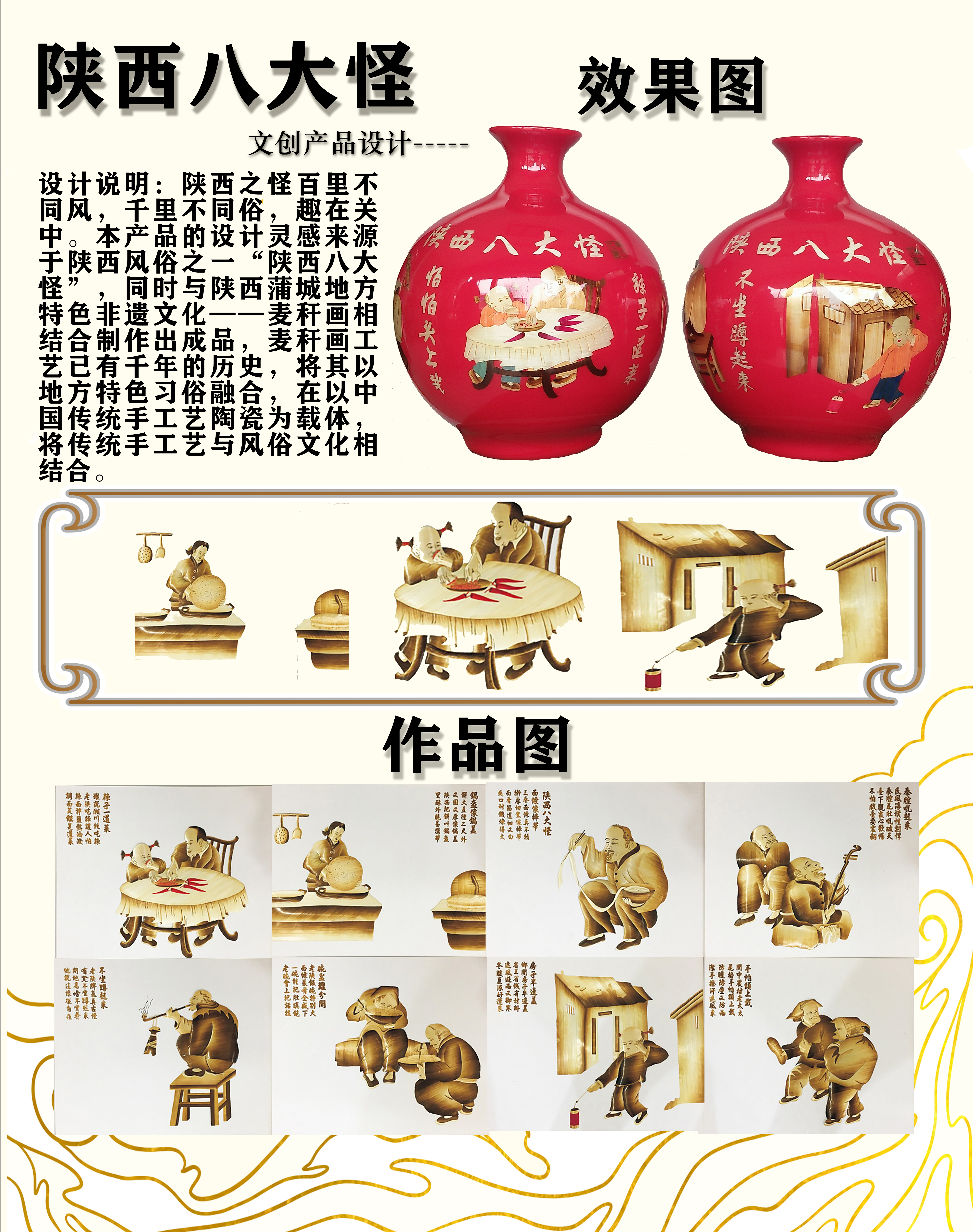 陕西之怪百里不同风,千里不同俗,趣在关中。本产品的设计灵感来源于陕西风俗之一“陕西八大怪”,同时与陕西蒲城地方特色非遗文化——麦秆画相结合制作出成品,麦秆画工艺已有千年的历史,将其以地方特色习俗融合,在以中国传统手工艺陶瓷为载体,将传统手工艺与风俗文化相结合。