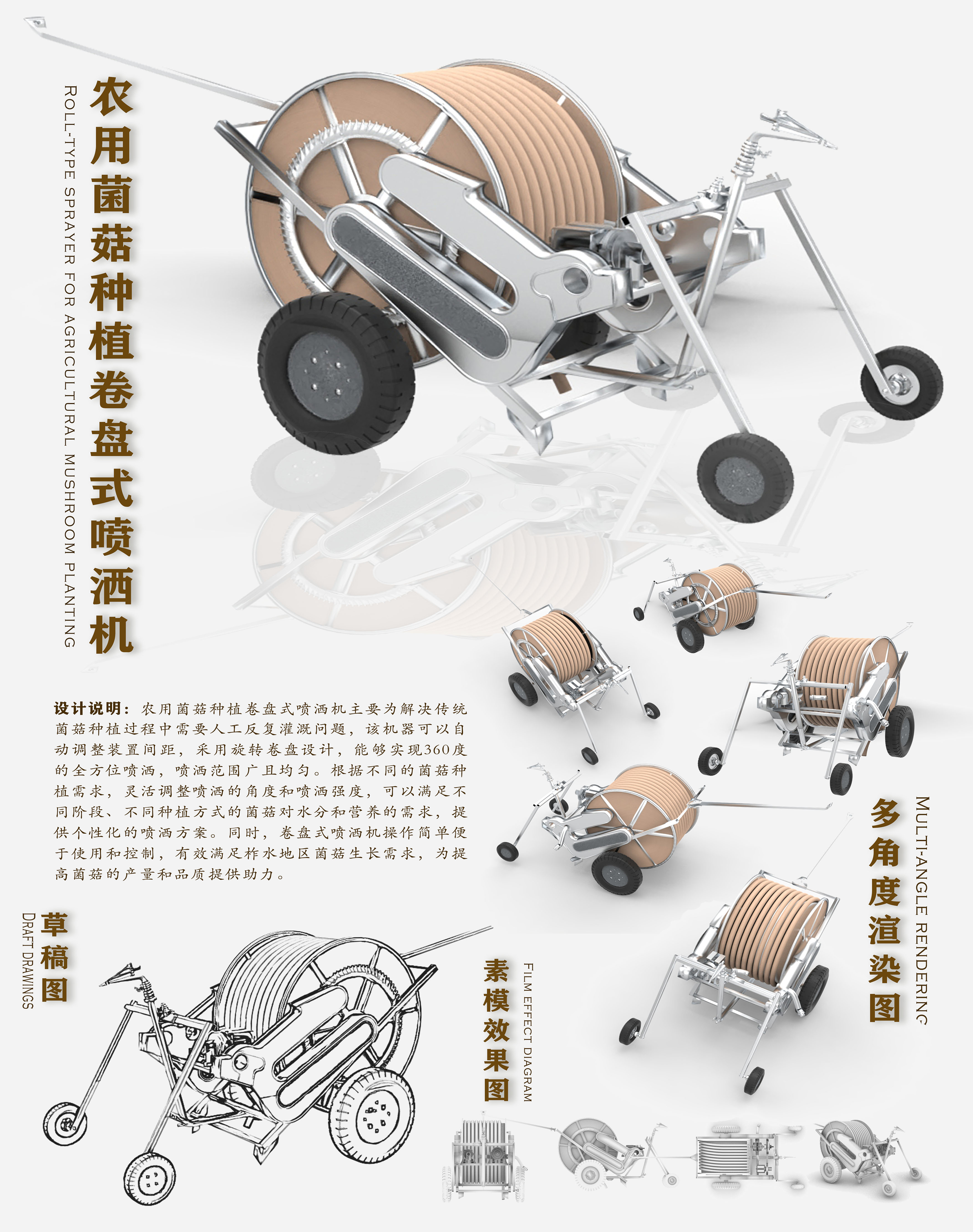 农用菌菇种植卷盘式喷洒机主要为解决传统菌菇种植过程中需要人工反复灌溉问题,该机器可以自动调整装置间距,采用旋转卷盘设计,能够实现360度的全方位喷洒,喷洒范围广且均匀。根据不同的菌菇种植需求,灵活调整喷洒的角度和喷洒强度,满足不同阶段、不同种植方式的菌菇对水分和营养的需求,提供个性化的喷洒方案。同时,卷盘式喷洒机操作简单便于使用和控制,有效满足柞水地区菌菇生长需求,为提高菌菇的产量和品质提供助力。
