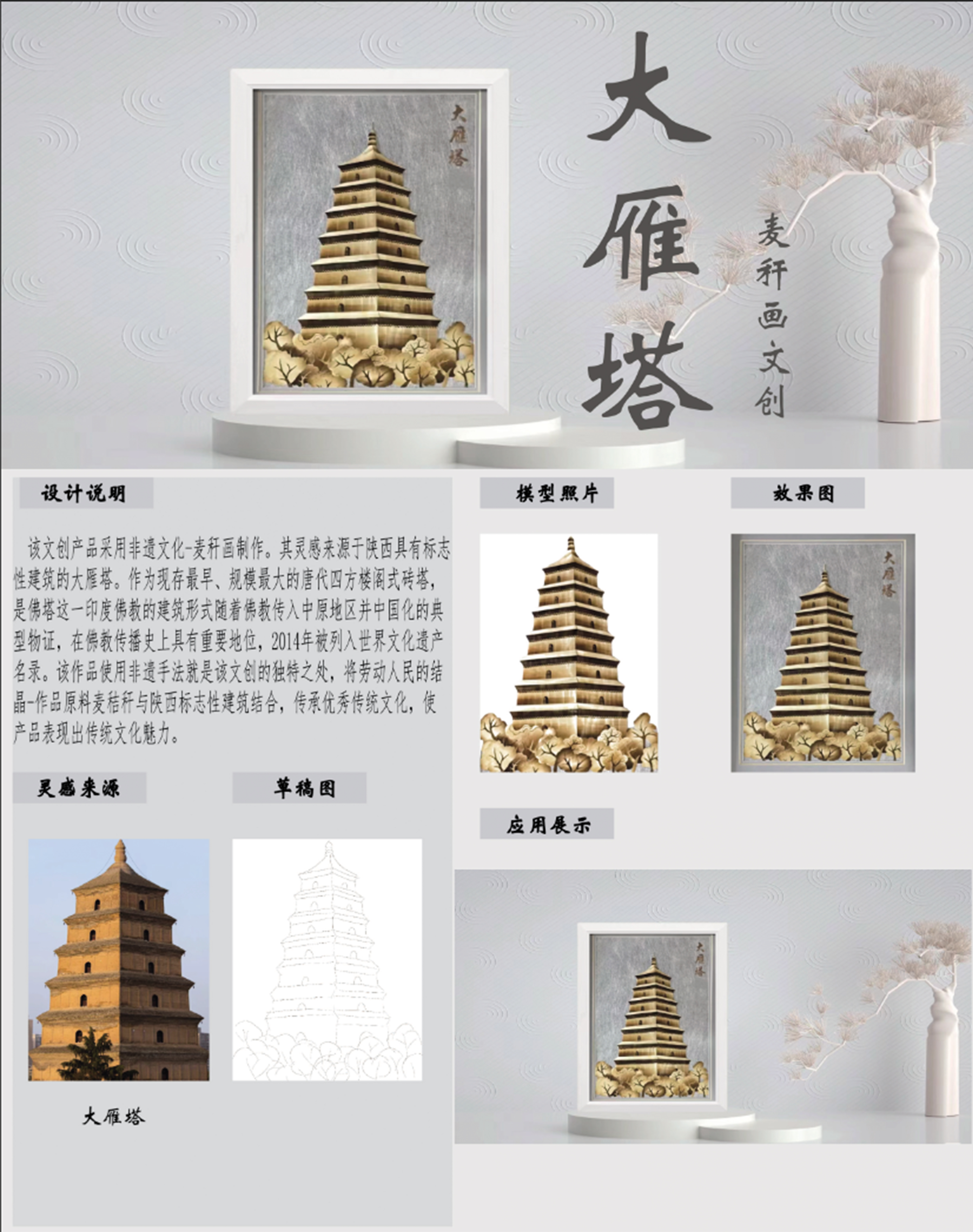 该文创产品采用非遗文化-麦秆画制作。其灵感来源于陕西具有标志性建筑的大雁塔。作为现存最早、规模最大的唐代四方楼阁式砖塔,是伟塔这一印度佛教的建筑形式随着佛教传入中原地区并中国化的其型物证,在佛教传播交上具有重要地位,2014年被列入世界文化遗产名录。该作品使用非遗手法就是该文创的独特之处,将劳动人民的结晶-作品原料麦秸行与陕目标志性建筑结合,传承优秀传统文化,使产品表现出传统文化魅力。