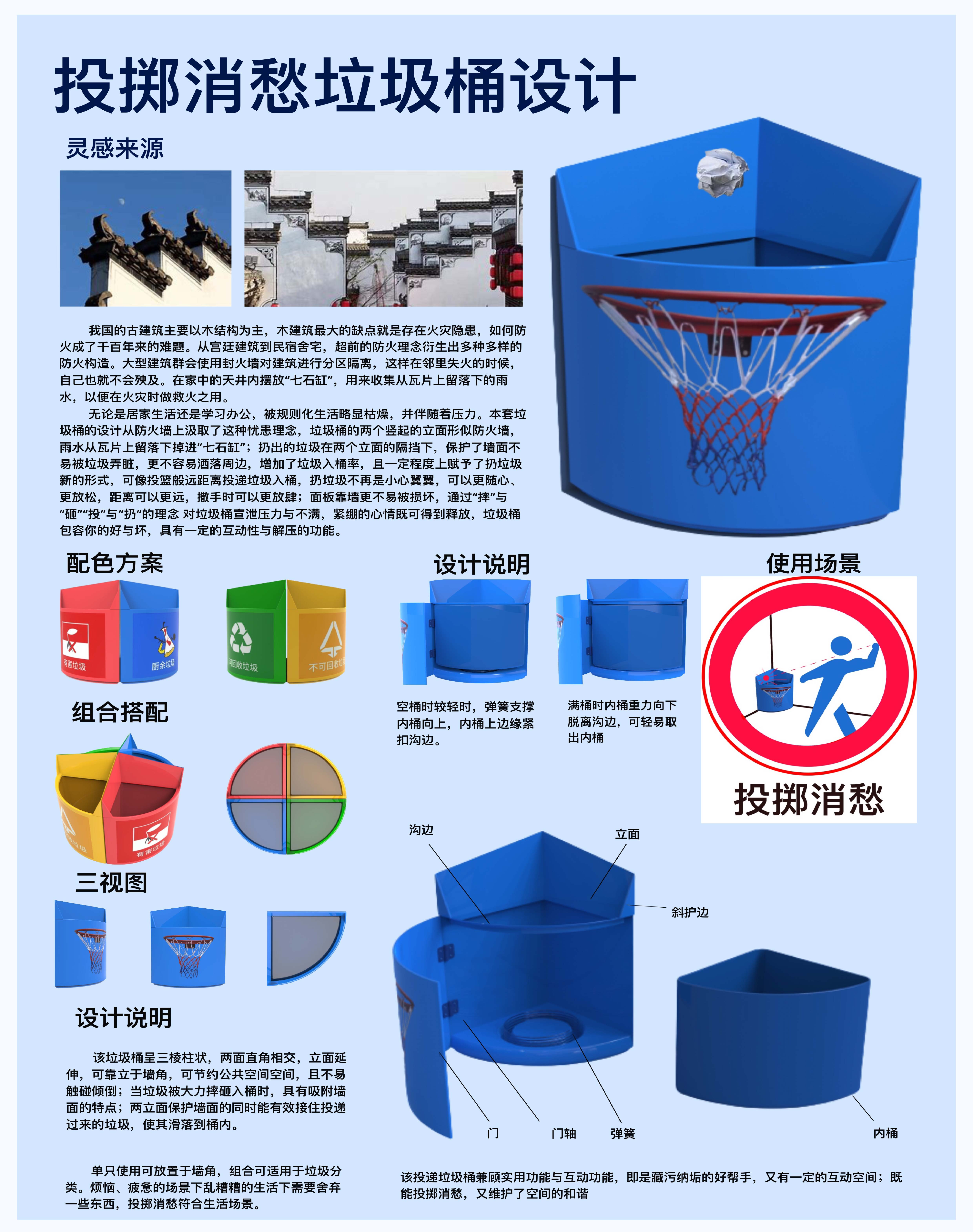 该垃圾桶呈三棱柱状,两面直角相交,立面延伸,可靠立于墙角,可节约公共空间空间,且不易触碰;可像投篮般远距离投递垃圾入桶,一定程度上赋予了扔垃圾新的形式,扔垃圾不再是小心翼翼,可以更随心、更放松,距离可以更远,撒手时可以更放肆;面板靠墙更不易被损坏,通过“摔”与“砸”“投”与”扔“的理念 对垃圾桶宣泄压力与不满,紧绷的心情既可得到释放,具有一定的互动性,改变平常扔垃圾的方式,从而带来不同的生活体验。