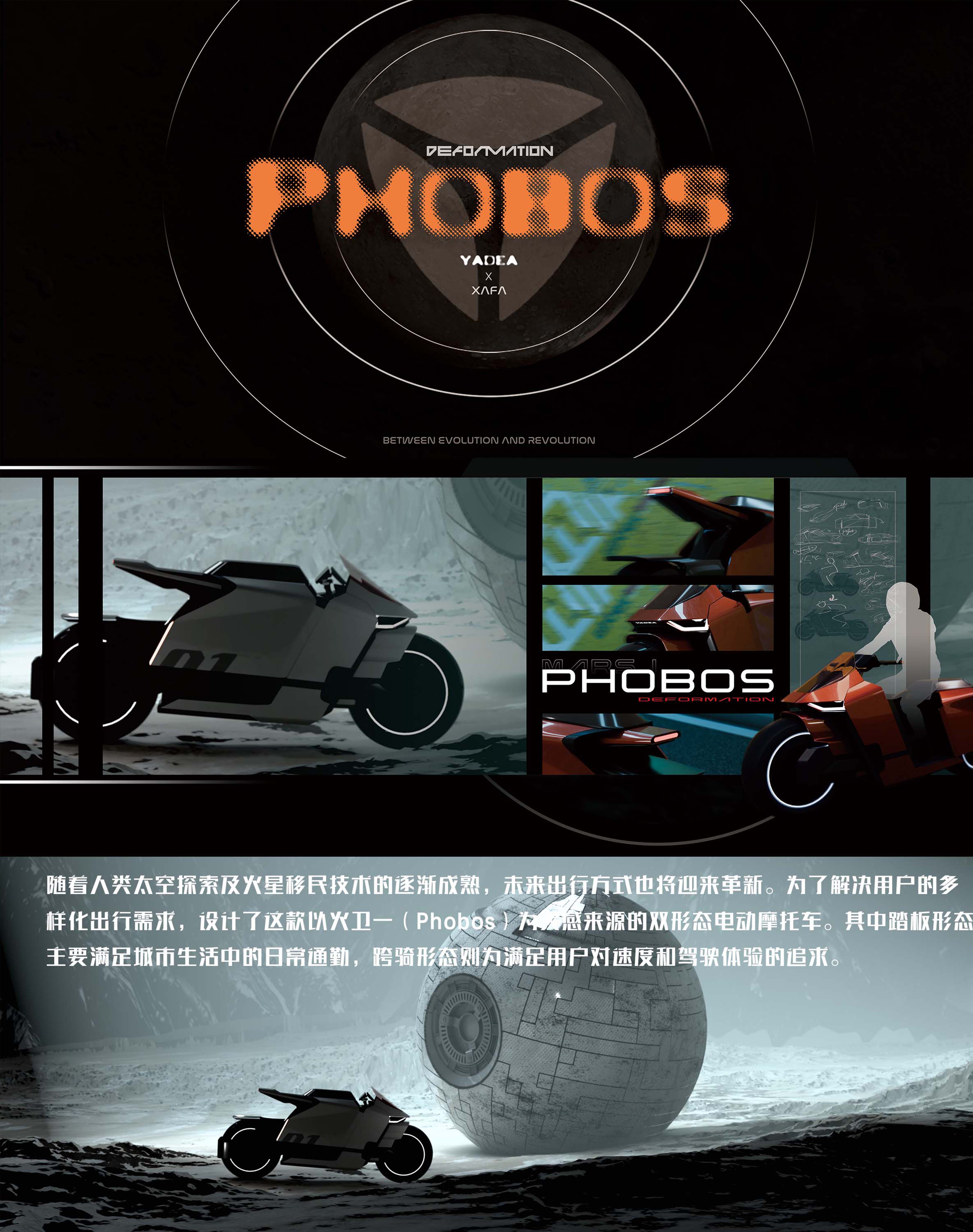 随着人类太空探索及火星移民技术的逐渐成熟,未来出行方式也将迎来革新。为了解决用户的多样化出行需求,设计了这款以火卫一(Phobos)为灵感来源的双形态电动摩托车。其中踏板形态主要满足城市生活中的日常通勤,跨骑形态则为满足用户对速度和驾驶体验的追求。“Phobos“一词源自希腊神话中战神阿瑞斯之子的名字,是 “火卫一”的别称。