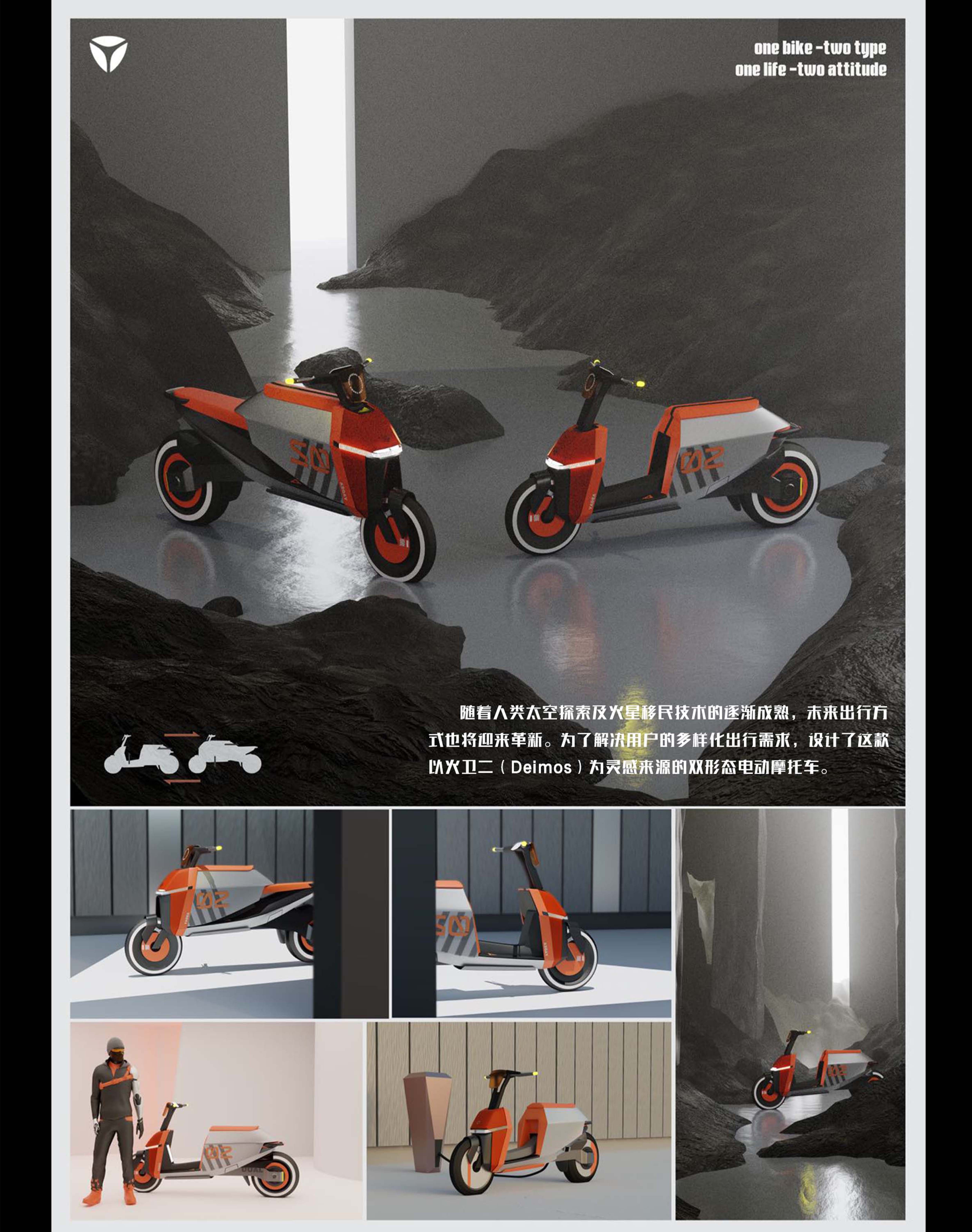 随着人类太空探索及火星移民技术的逐渐成熟,未来出行方式也将迎来革新。为了解决用户的多样化出行需求,设计了这款以火卫二(Deimos)为灵感来源的双形态电动摩托车。其中踏板形态主要满足城市生活中的日常通勤,跨骑形态则为满足用户对速度和驾驶体验的追求。火卫二被命名为Deimos,是希腊神话中表示恐惧的形像。