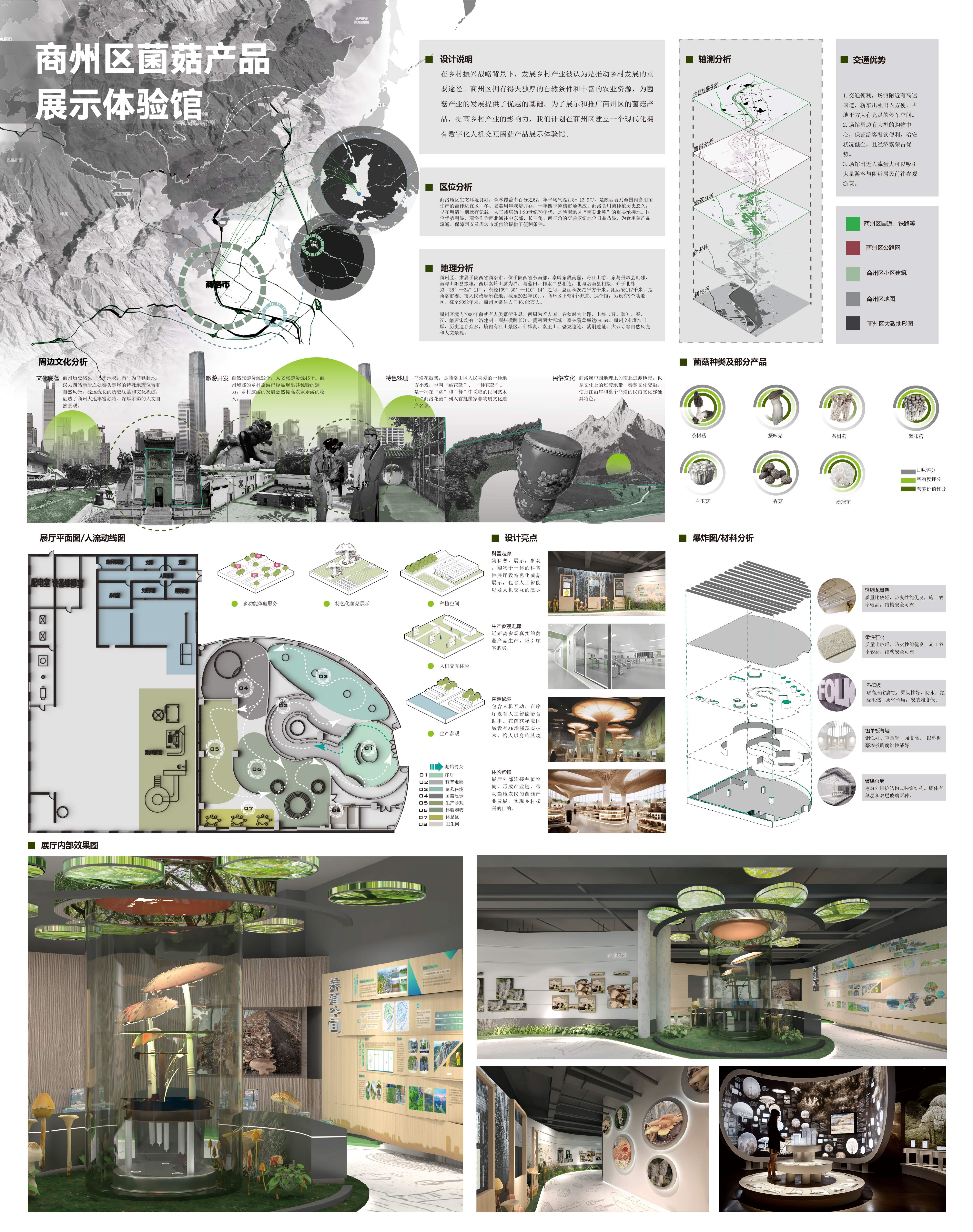 在乡村振兴战略背景下,发展乡村产业被认为是推动乡村发展的重要途径。商州区拥有得天独厚的自然条件和丰富的农业资源,为菌菇产业的发展提供了优越的基础。为了展示和推广商州区的菌菇产品,提高乡村产业的影响力,我们计划在商州区建立一个现代化的,拥有数字化人机交互体验,AR体验,沉浸式空间的菌菇产品展示体验馆。
