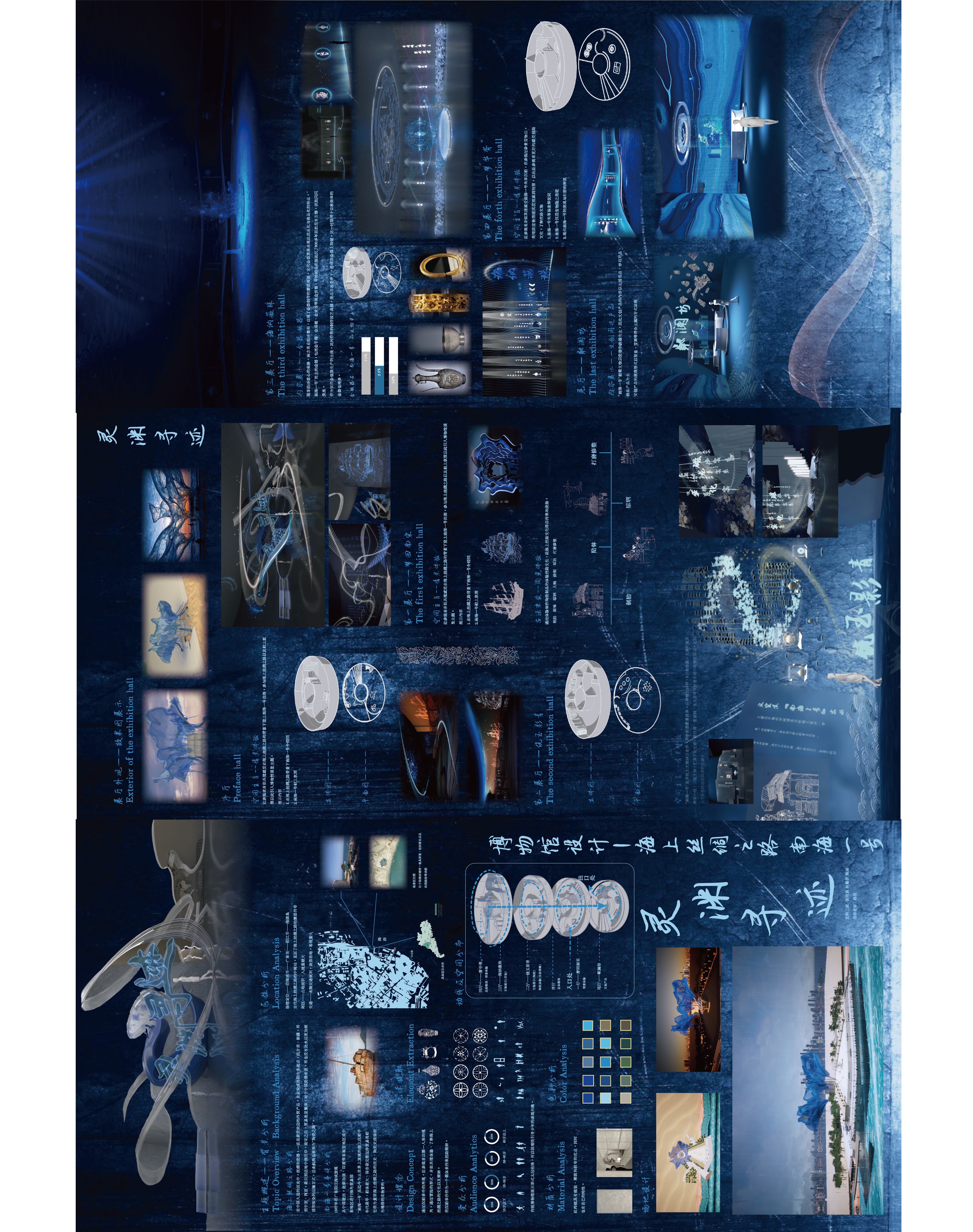 灵渊意为深水,寻迹意为找寻古迹,此标题旨在表达通过找寻深海宝藏,了解、传承海上丝绸之路的文化内涵。通过沉船事件的再现,让参观者以第一人称的视角,通过冒险的形式,身临其境体验、了解海上丝绸之路的文化以及精神。将沉船事件作为一个载体来传承丝路精神。
