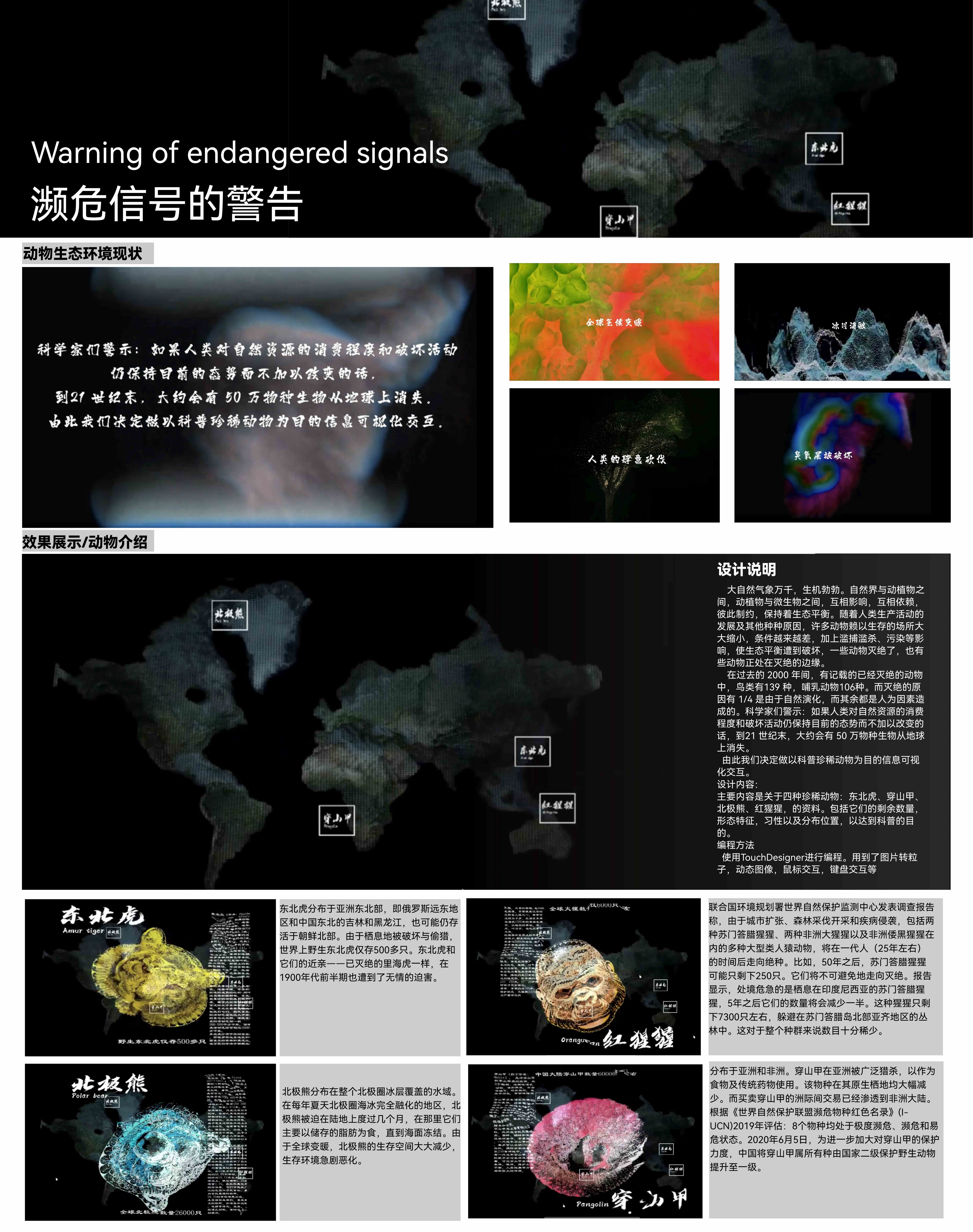 随着人类生产活动的发展及其他种种原因,许多动物赖以生存的场所大大缩小,加上滥捕滥杀、污染等影响,使生态平衡遭到破坏,一些动物灭绝了,也有些动物正处在灭绝的边缘。 设计内容: 主要内容是关于四种珍稀动物:东北虎、穿山甲、北极熊、红猩猩,的资料。包括它们的剩余数量,形态特征,习性以及分布位置,以达到科普的目的。 使用TouchDesigner进行编程。用到了图片转粒子,动态图像,鼠标交互,键盘交互等