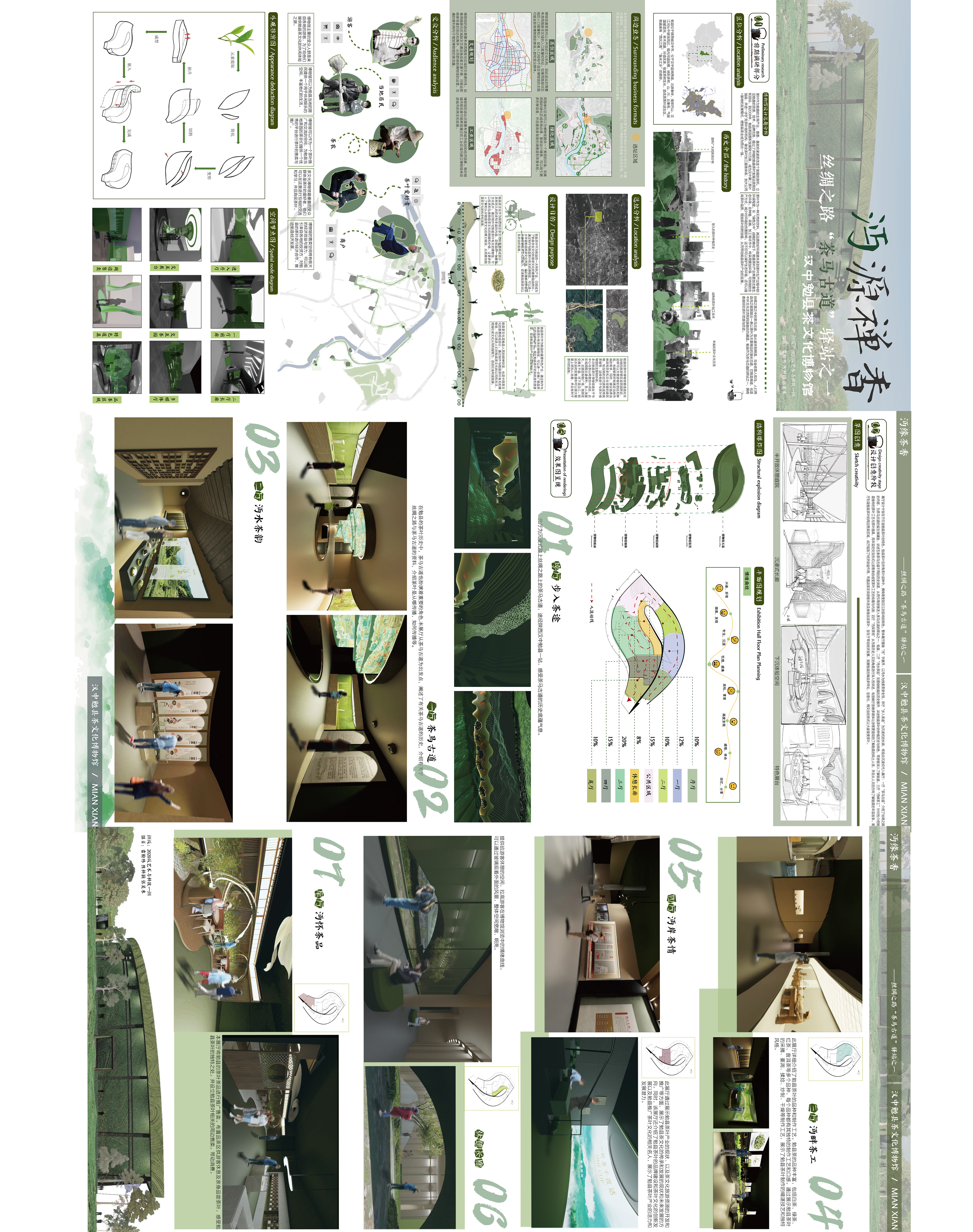 勉县茶文化博物馆旨在展示和传承勉县茶文化的历史、价值和发展。设计理念包括融合自然和文化、展示与互动、空间流线与体验、教育与研究功能。充分融合勉县的自然环境和丰富的文化背景,创造与勉县茶文化相呼应的氛围。其中部分展厅,采用多媒体展示方式,丰富观众的感官体验。同时为了吸引观众的兴趣和参与度,博物馆设计注重展示和互动性。设置互动体验区域和茶艺表演区,观众可以亲身参与茶文化的体验,加深对茶文化的理解。