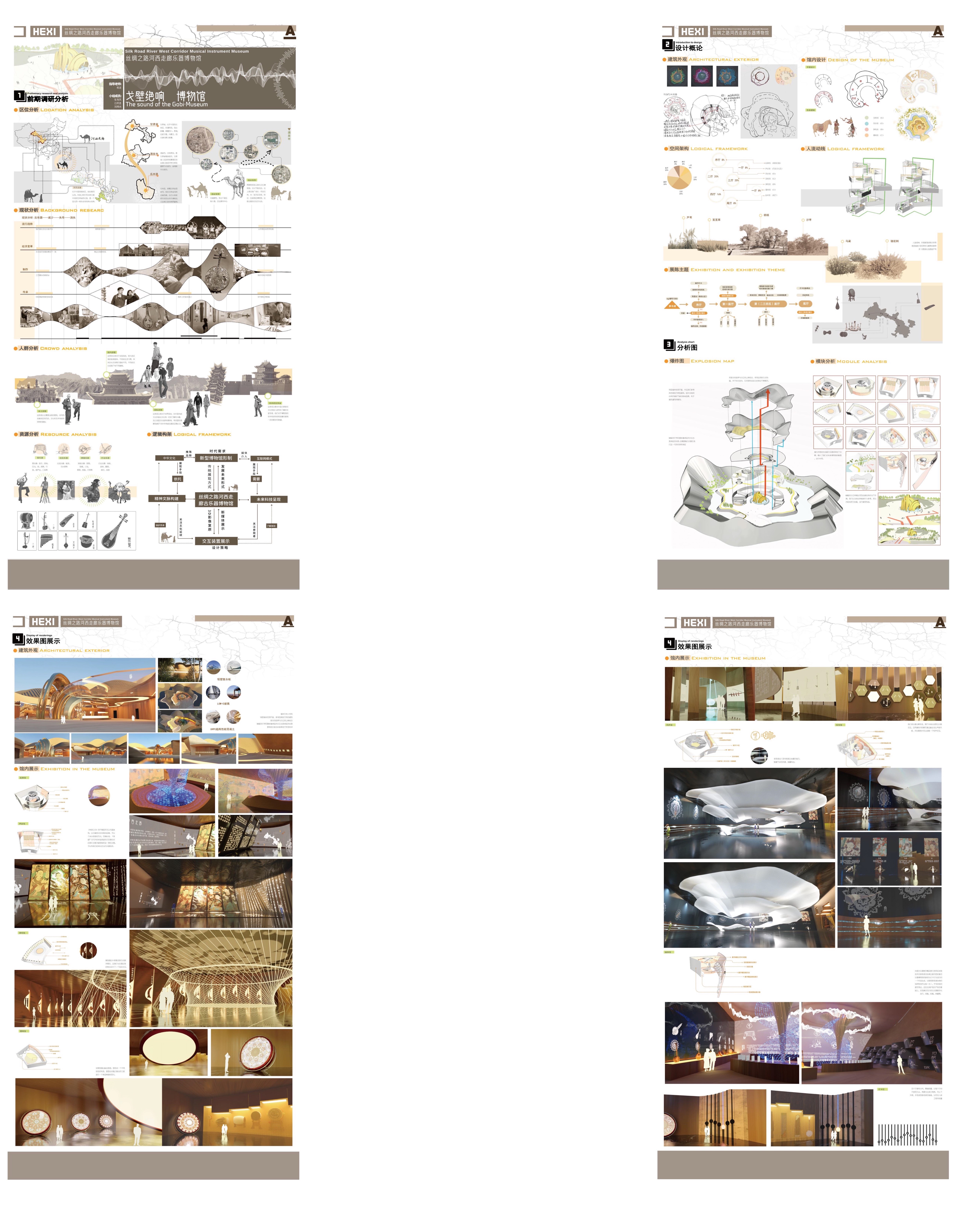 戈壁绝响---丝路河西走廊古乐器博物馆是以保护和传承丝路古乐器文化为目的的新型博物馆,主要选取了河西走廊地区的器乐进行保护和研究。 建筑整个外观采用了音乐可视化曲线,并与沙丘山脊结合,展现了音乐的韵律感。屋顶蜿蜒的灯带即意味着绵延的沙丘也是绵延的丝路,同时加上音量波动可视化的线条使建筑顶部更加丰富。建筑外墙采用仿夯土材料,并参考西域地方特色建筑设计了洞窗,使建筑巧妙融合了音乐韵律与地方建筑特色。