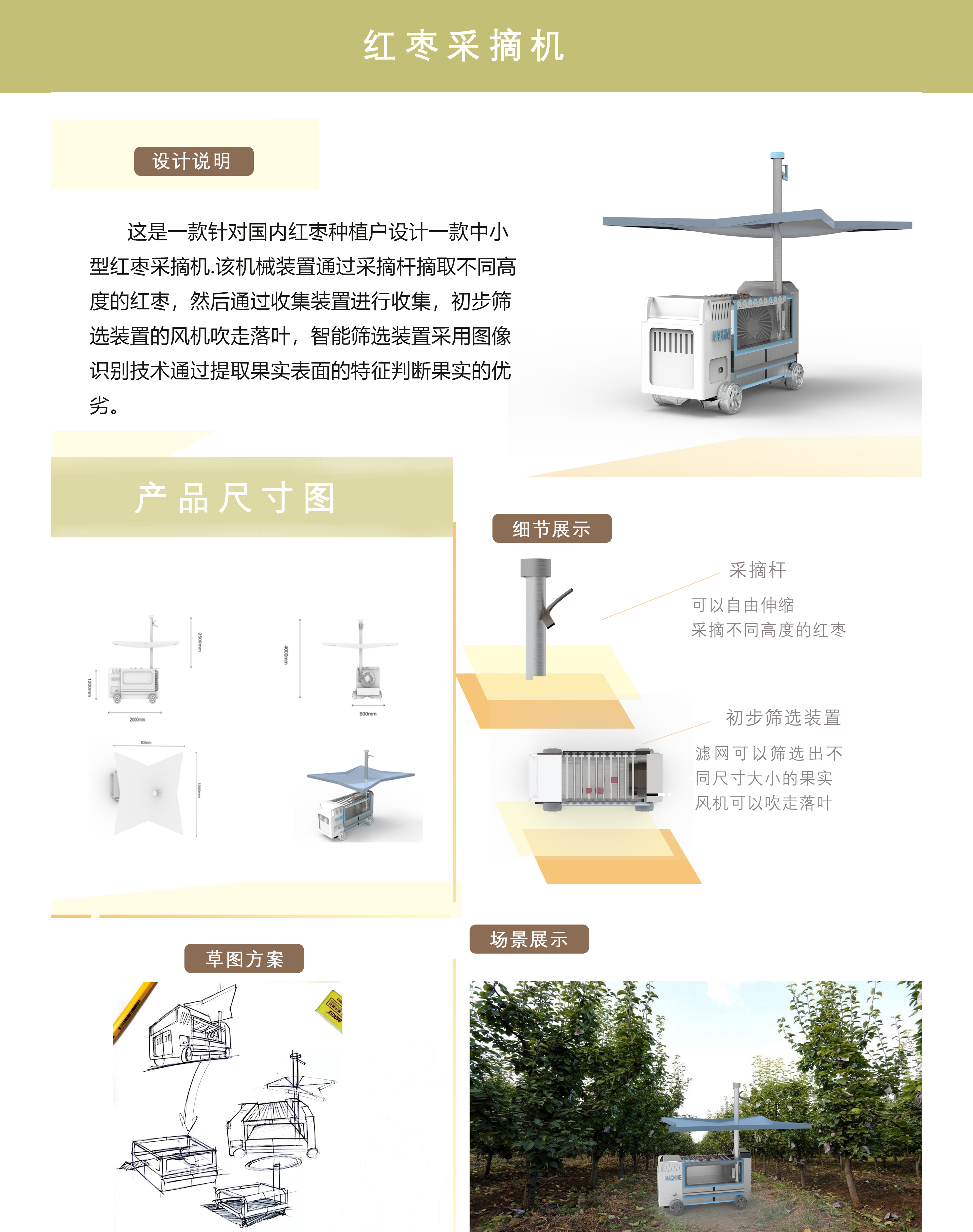 这是一款针对红枣种植户设计的中小型红枣采摘机.该机械装置通过采摘杆摘取不同高度的红枣,收集装置收集红枣,落下的红枣依次首先通过初步筛选装置,该装置内部的风机可以吹走落叶,然后再将红枣传送到智能筛选装置,采用图像识别技术通过提取果实表面的特征判断红枣的优劣。最终输出优质红枣。
