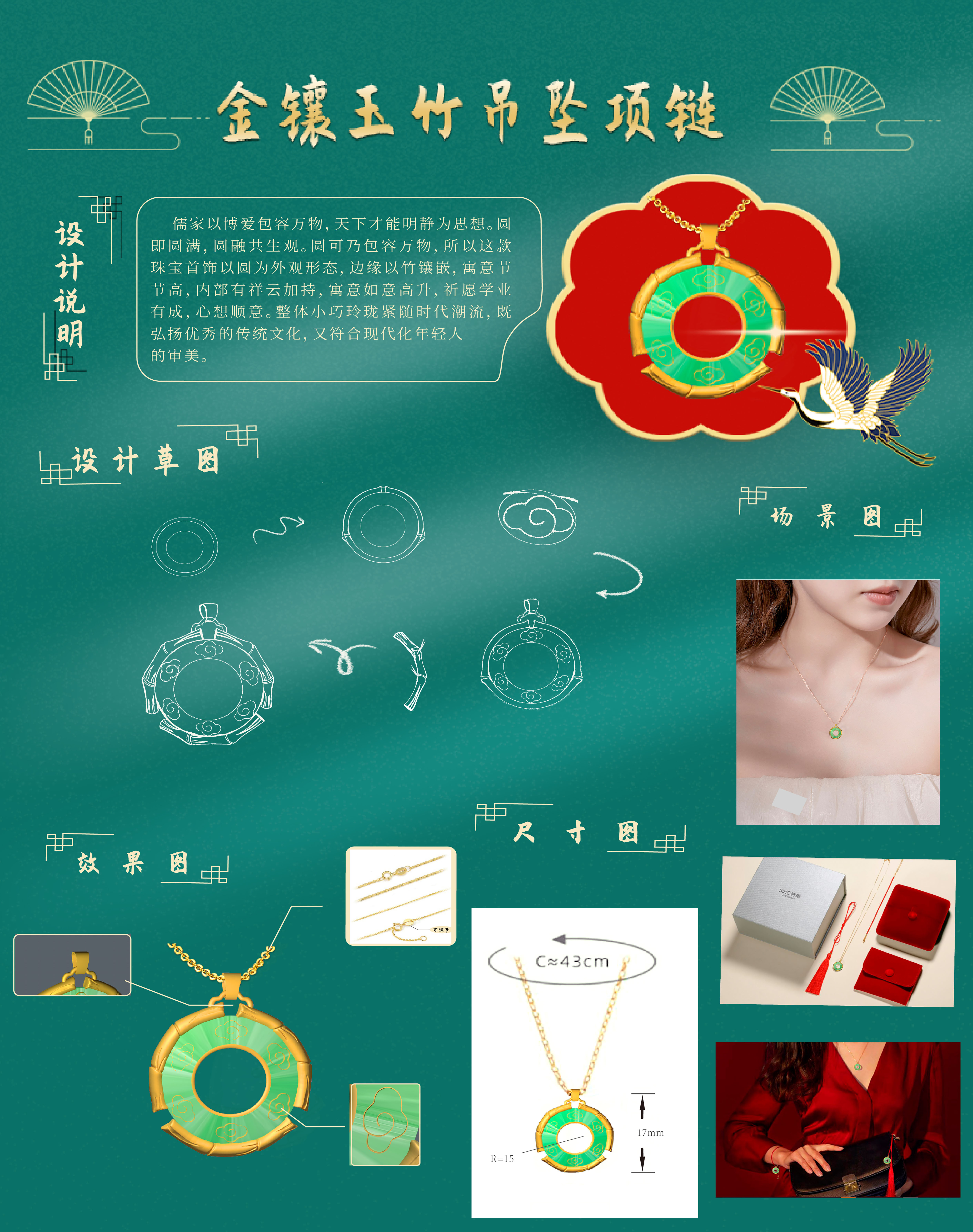 本设计灵感来源于儒家以博爱包容万物,天下才能明静为思想。圆即圆满,圆融共生观。圆可乃包容万物,所以这款珠宝首饰以圆为外观形态,边缘以竹镶嵌,寓意节节高,内部有祥云加持,寓意如意高升,祈愿学业有成.心想顺意。整体小巧玲珑紧随时代潮流,既弘扬优秀的传统文化,又符合现代化年轻人的审美。