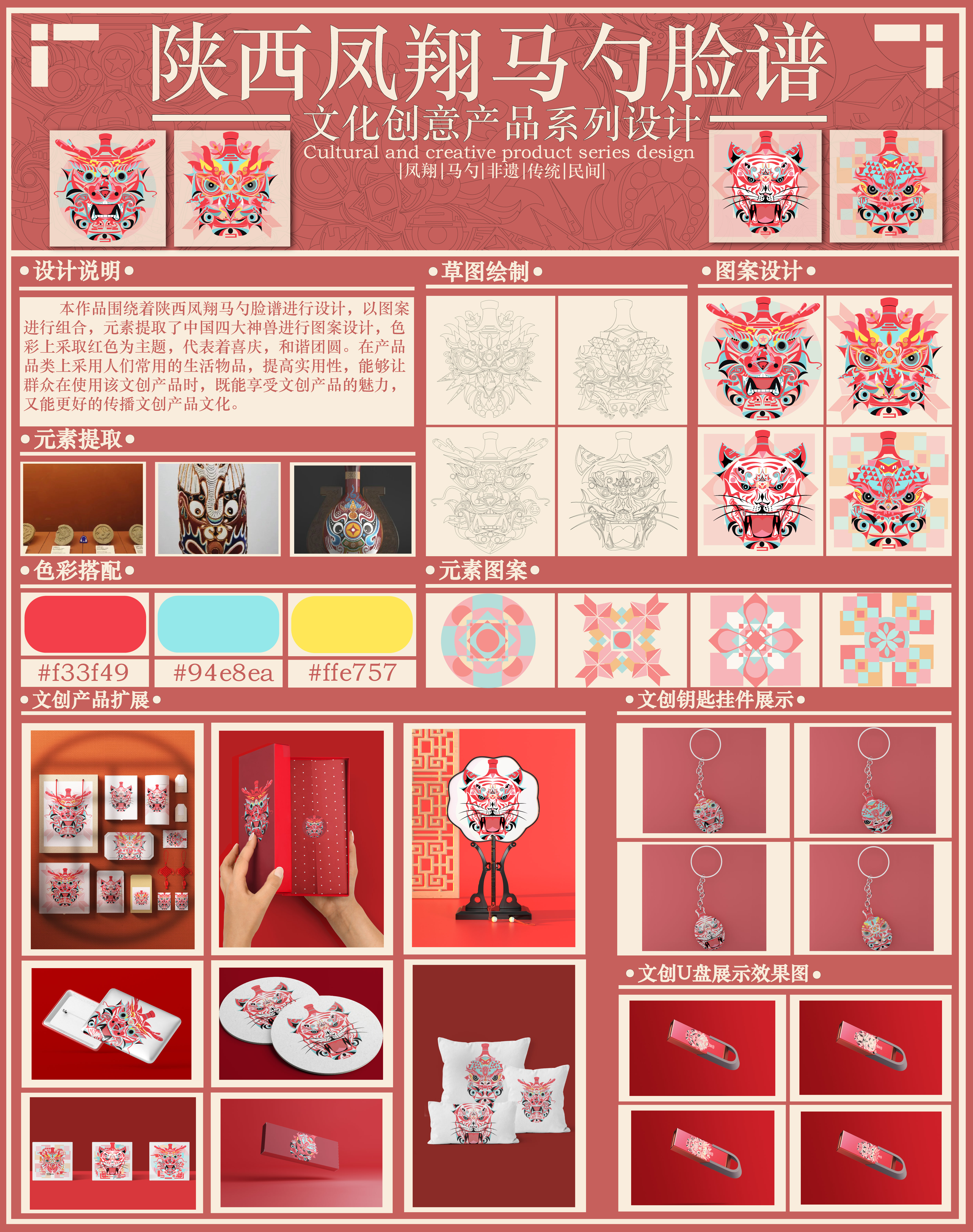 本作品围绕着陕西凤翔马勺脸谱进行设计,以图案进行组合,元素提取了中国四大神兽进行图案设计,色彩上采取红色为主题,代表着喜庆,和谐团圆。在产品品类上采用人们常用的生活物品,提高实用性,能够让群众在使用该文创产品时,既能享受文创产品的魅力,又能更好的传播文创产品文化。
