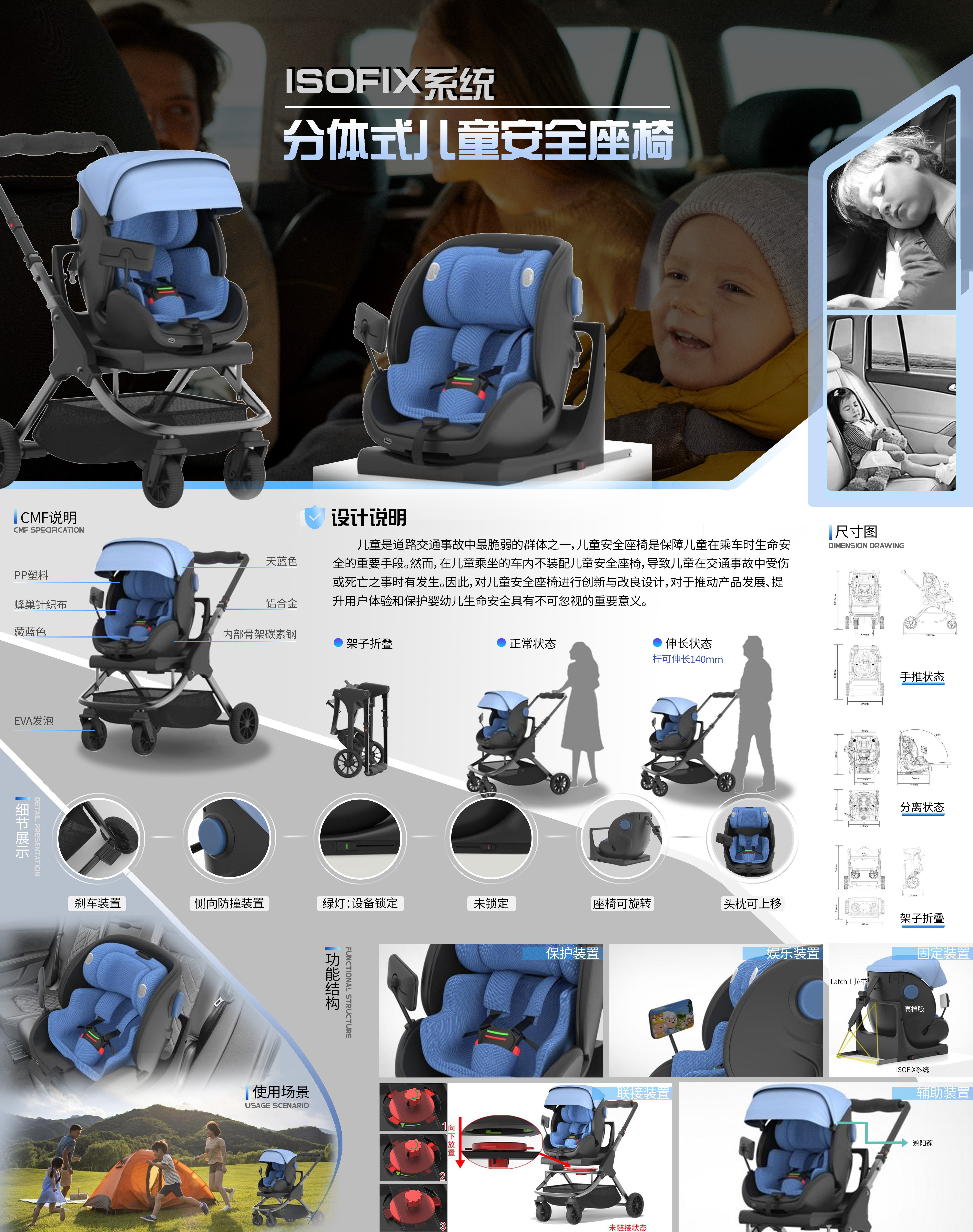 儿童是道路交通事故中最脆弱的群体之一,儿童安全座椅是保障儿童在乘车时生命安全的重要手段。然而,在儿童乘坐的车内不装配儿童安全座椅,导致儿童在交通事故中受伤或死亡之事时有发生。因此,对儿童安全座椅进行创新与改良设计,对于推动产品发展、提升用户体验和保护婴幼儿生命安全具有不可忽视的重要意义。