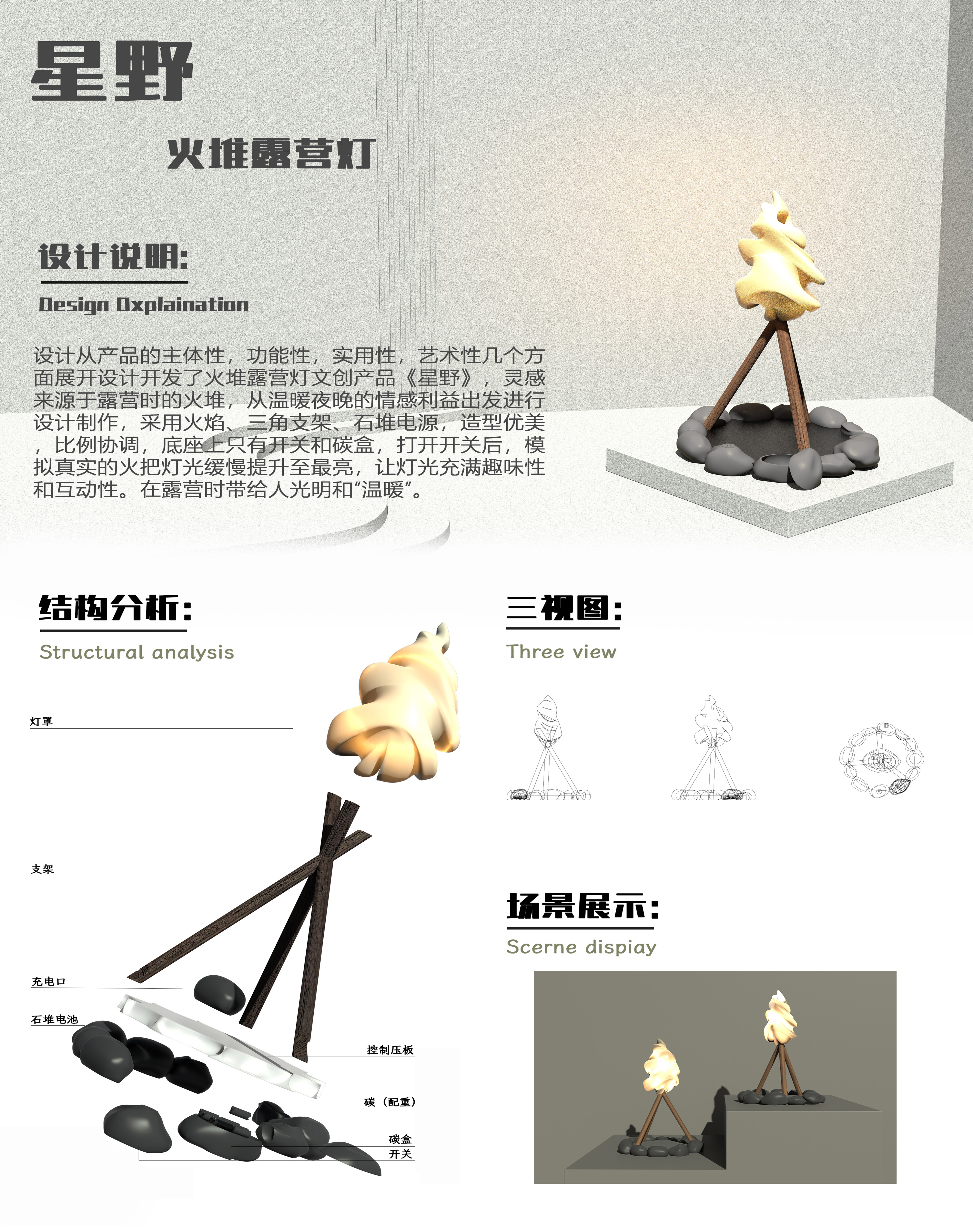 设计从产品的主体性,功能性,实用性,艺术性几个方面展开设计开发了火堆露营灯文创产品《星野》,灵感来源于露营时的火堆,从温暖夜晚的情感利益出发进行设计制作,采用火焰、三角支架、石堆电源,造型优美,比例协调,底座上只有开关和碳盒,打开开关后,模拟真实的火把灯光缓慢提升至最亮,让灯光充满趣味性和互动性。在露营时带给人光明和“温暖”。