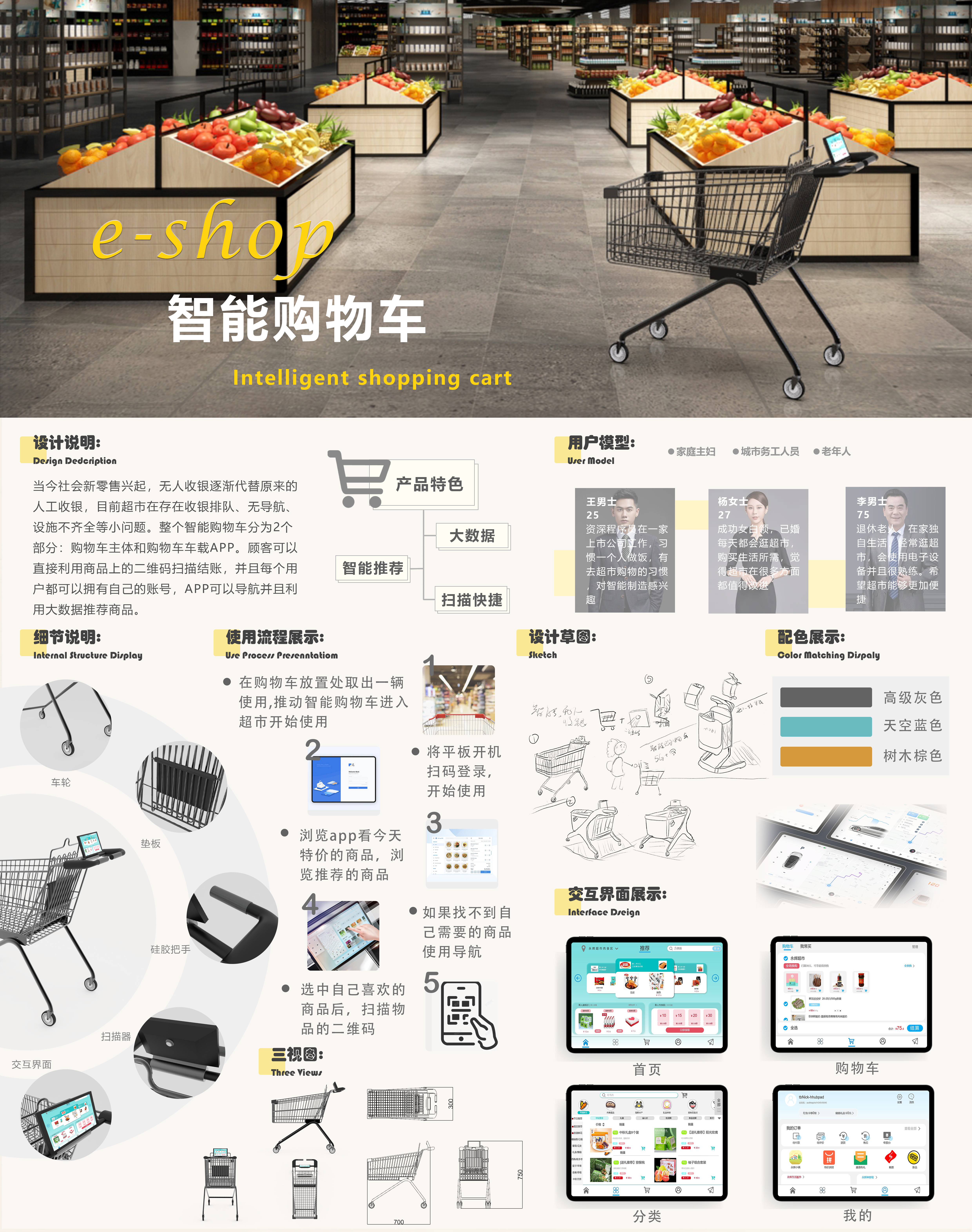 当今社会新零售兴起,无人收银逐渐代替原来的人工收银,目前超市在存在收银排队、无导航、设施不齐全等问题。基于以上问题设计出智能购物车e-shop。整个智能购物车分为2个部分:购物车主体和购物车车载APP。顾客可以直接利用商品上的二维码扫描结账,并且每个用户都可以拥有自己的账号,APP可以导航并且利用大数据推荐商品。