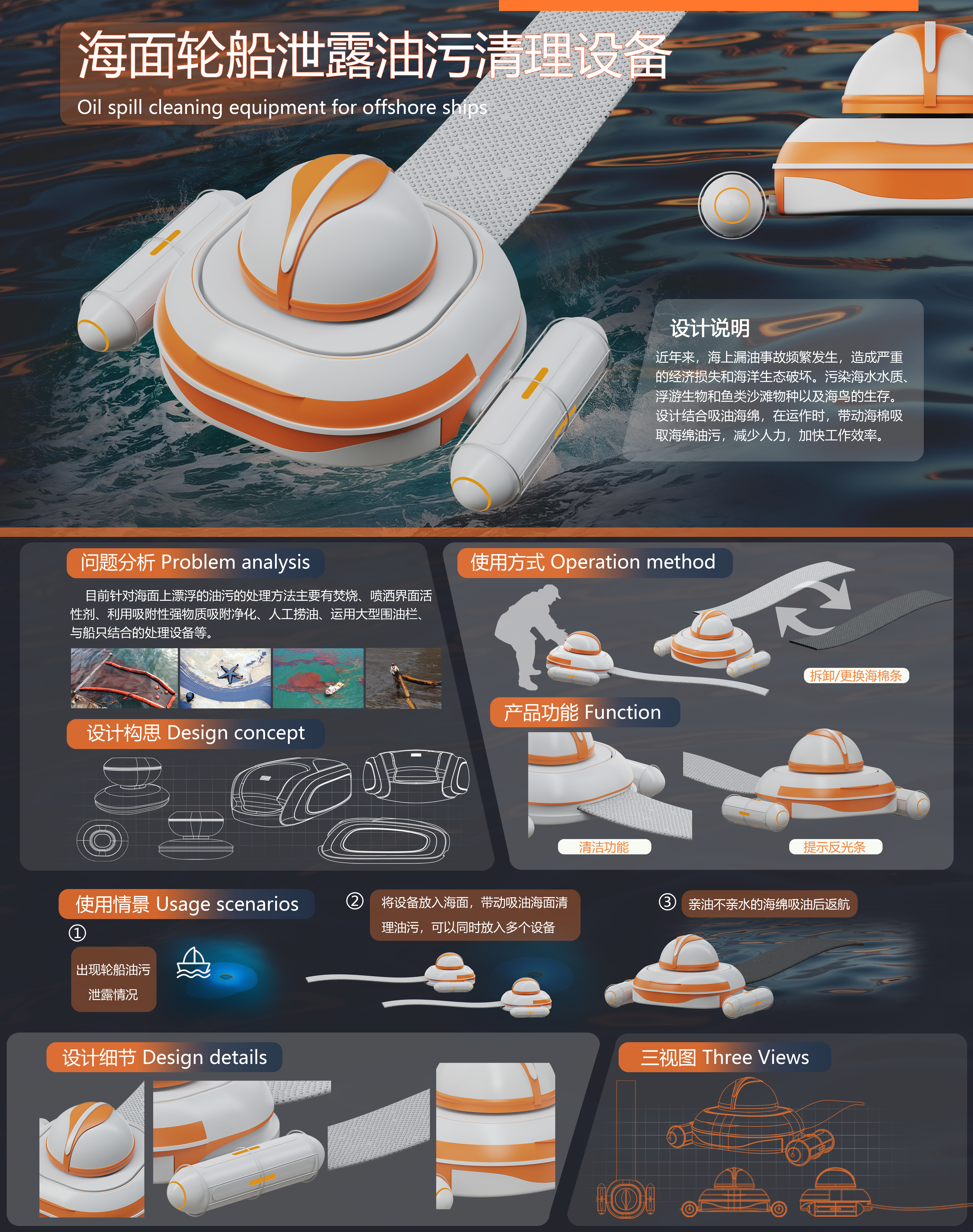 近年来,海上漏油事故频繁发生,造成严重的经济损失和海洋生态破坏。污染海水水质、浮游生物和鱼类沙滩物种以及海鸟的生存。设计结合吸油海绵,在运作时,带动海棉吸取海绵油污,减少人力,加快工作效率。