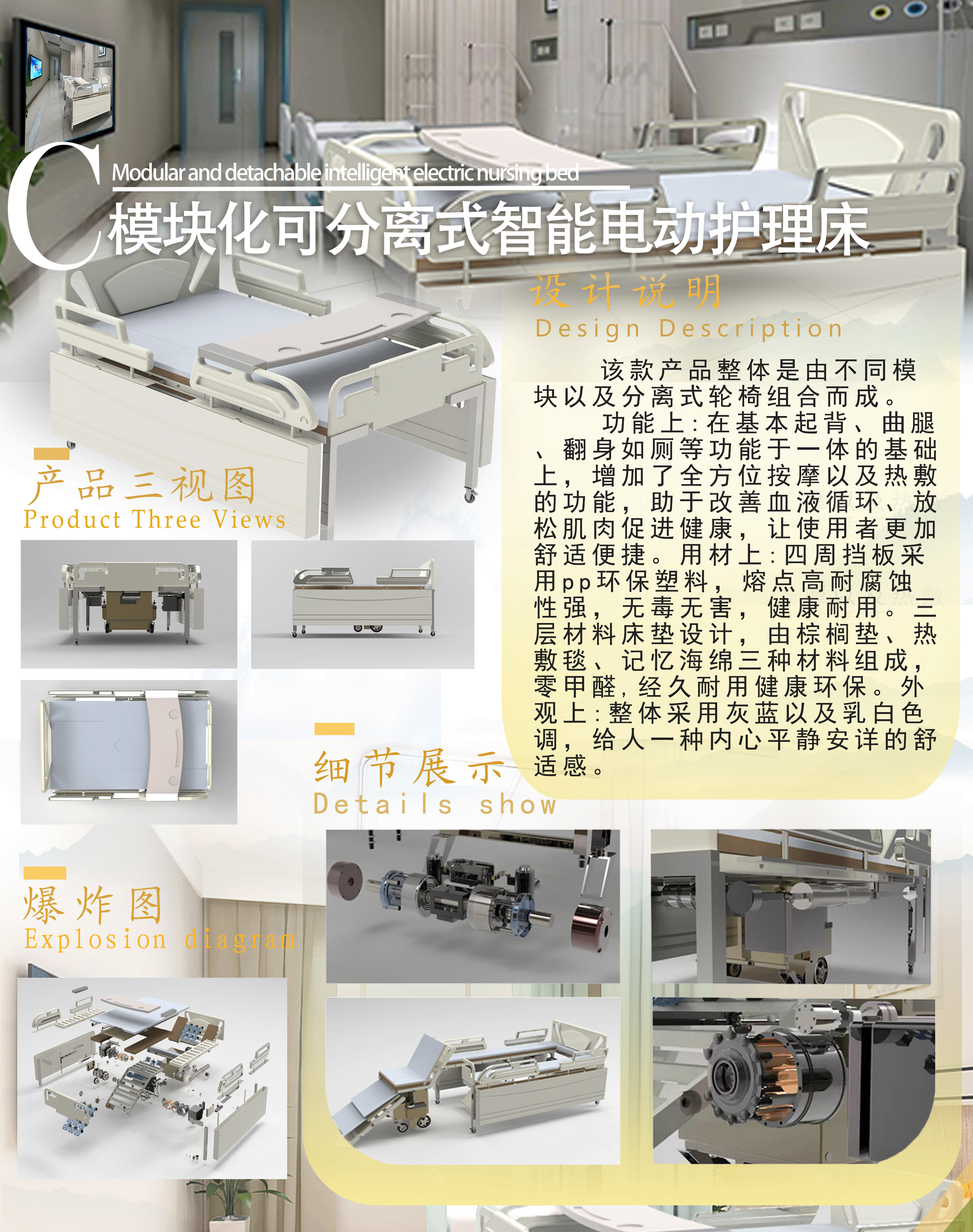 该款产品整体是由不同模块以及分离式轮椅组合而成。 功能上: 在基本起背、曲腿翻身如厕等功能于一体的基础上,增加了全方位一键按摩以及热敷的功能,助于改善血液循环。 用材上:四周挡板采用pp环保塑料,熔点高耐腐蚀性强,无毒无害。三层材料床垫设计,由棕榈垫、热敷毯、记忆海绵三种材料组成,零甲醛,经久耐用健康环保。 外观上: 整体采用灰蓝以及乳白色基调,给人一种内心平静安详的舒适感。