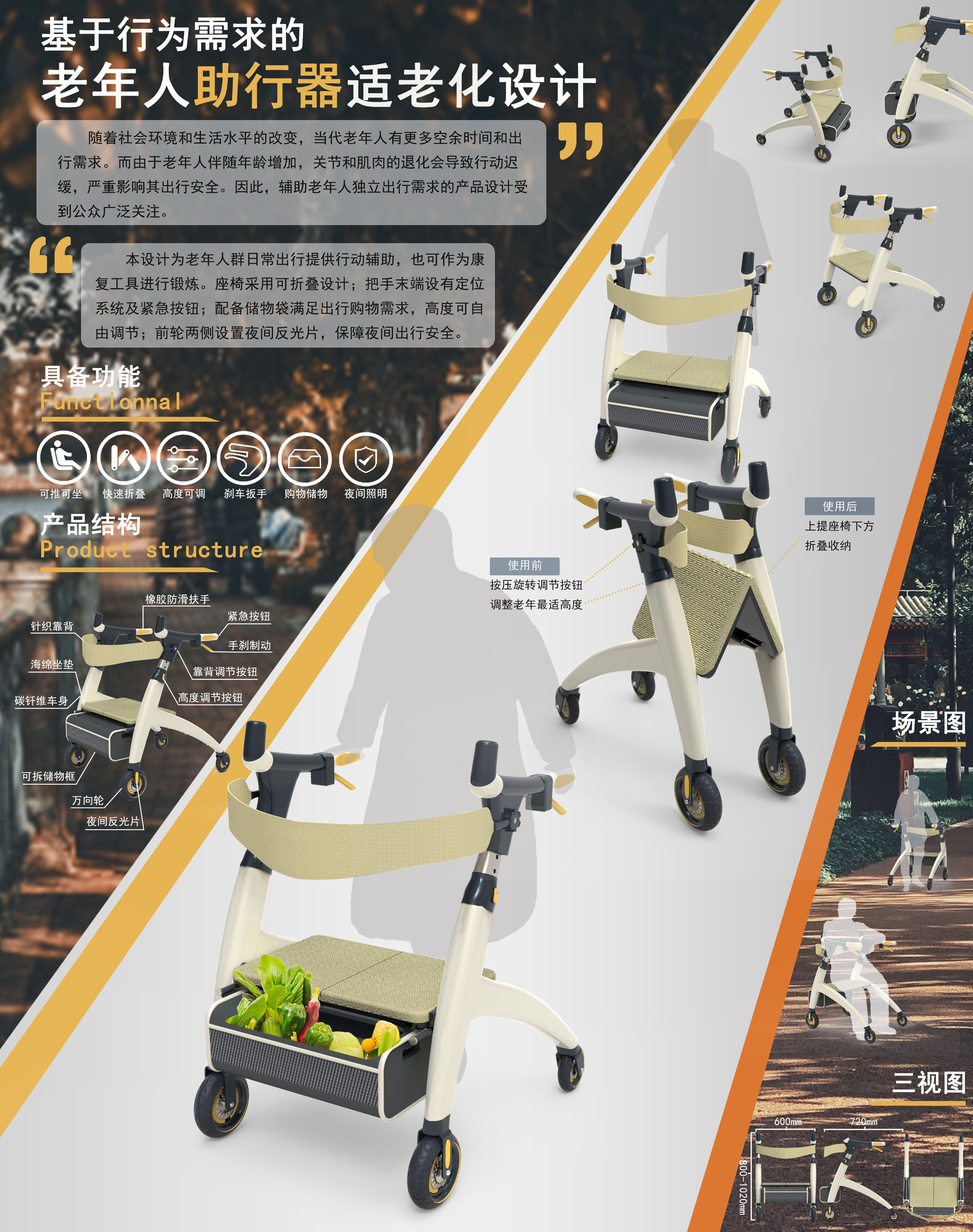 老年人关节和肌肉的退化会导致行动迟缓影响其出行安全,本设计可为老年人群日常出行提供行动辅助,也可作为康复工具进行锻炼。依据结构分为三大部分:把手、中部框架支撑和底部地面接触三大部分。上肢把手部分主要是把手和手刹,把手末端设有定位系统及紧急按钮;中部框架部分主要是助行器的整体框架结构,包括助行器的高度调节、座椅、储物篮和可折叠等;底部地面接触部分主要是车轮,前轮两侧设置夜间反光片,保障夜间出行安全。