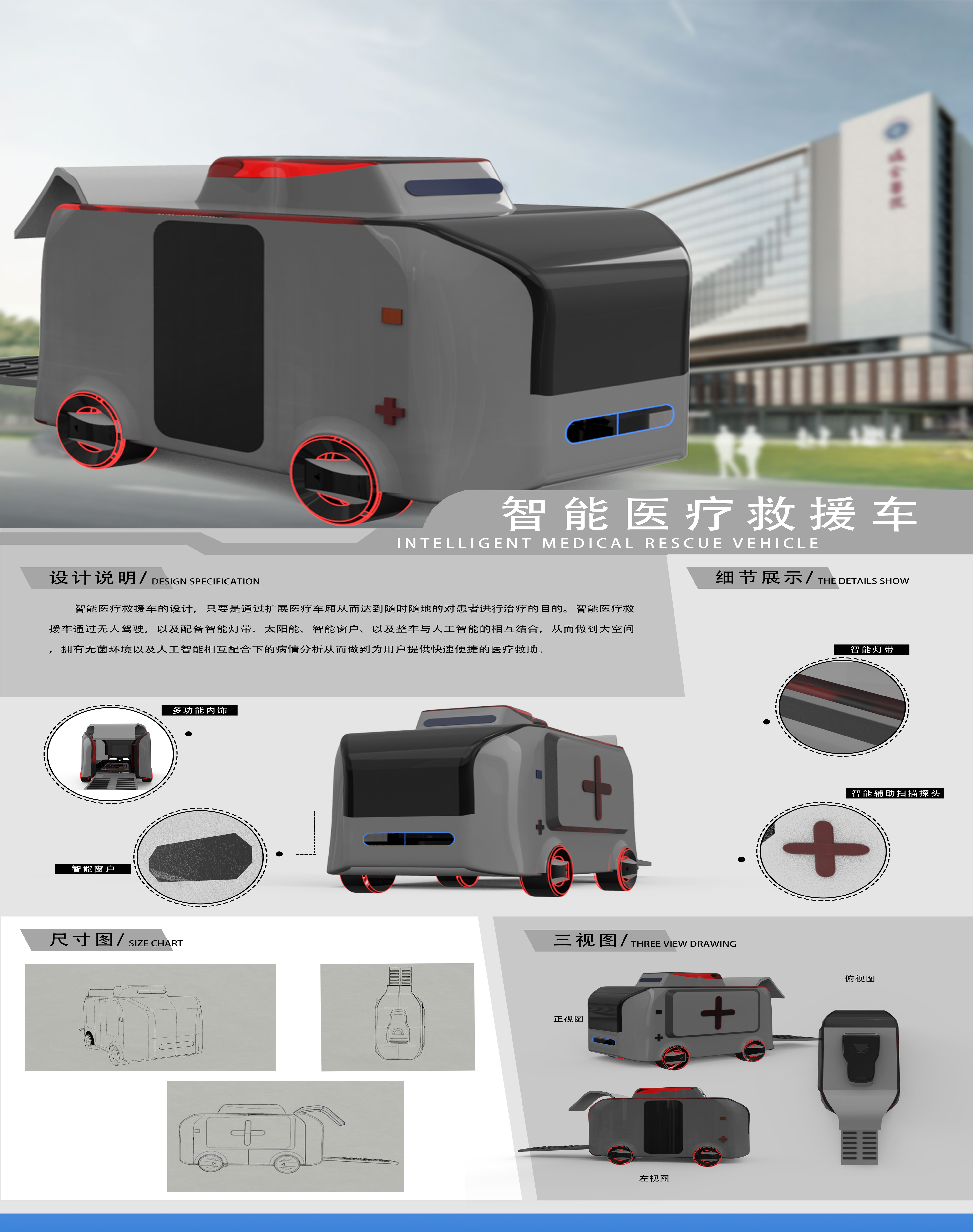 智能医疗救援车的设计,只要是通过扩展医疗车厢从而达到随时随地的对患者进行治疗的目的。智能医疗救援车通过无人驾驶,以及配备智能灯带、太阳能、智能窗户、以及整车与人工智能的相互结合,从而做到大空间,拥有无菌环境以及人工智能相互配合下的病情分析从而做到为用户提供快速便捷的医疗救助。