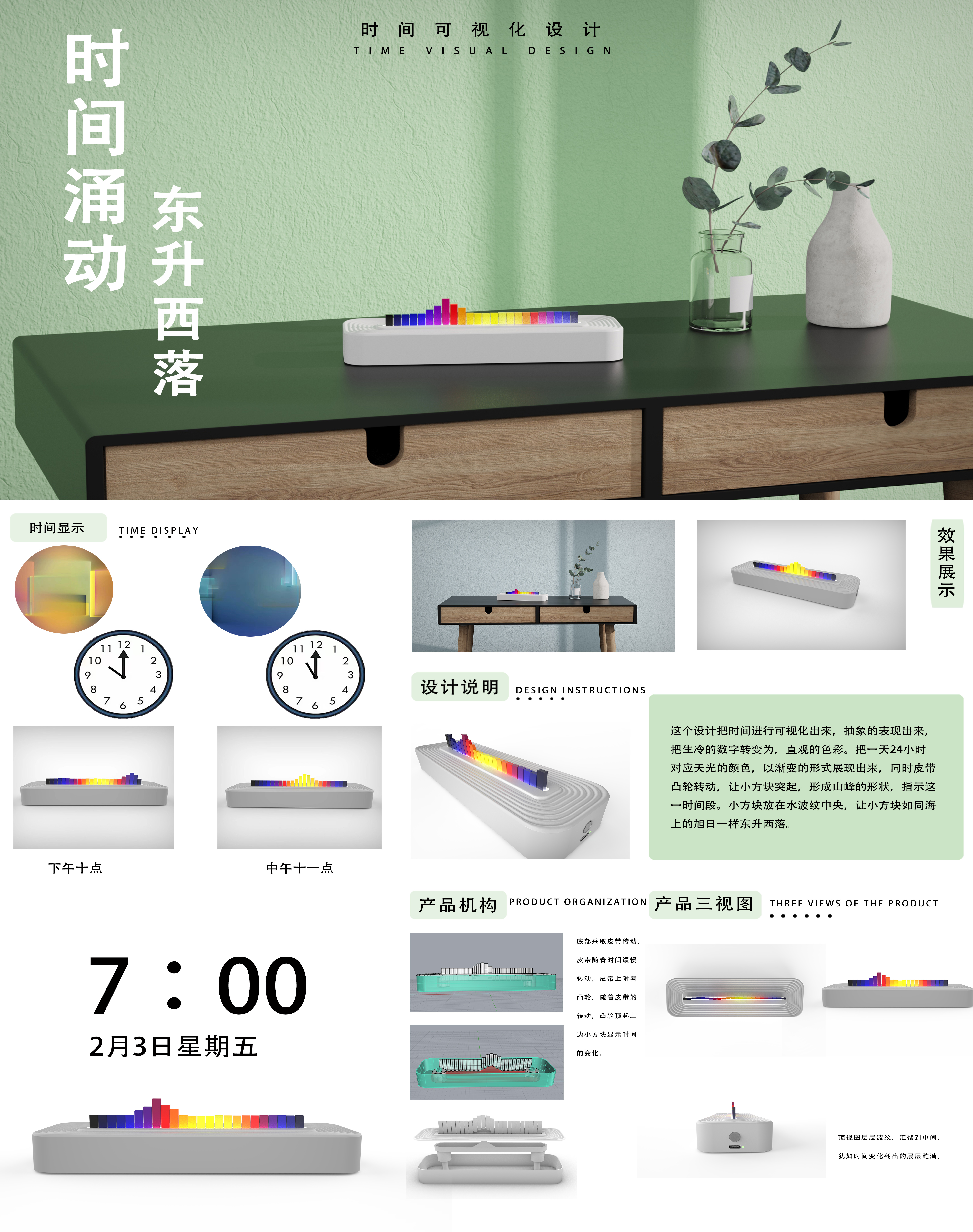 数字信息时代时间成了冷冰冰的数字或者是代码,人们都居住在钢筋混凝土之间,常常是低头还是白天,抬头一事深夜,人们对时间的感知越来越陌生,在印象中他仅是一串数字,忘记了时间本来的面貌,设计初衷,是让时间可视化,还原人们对时间最初的样子,让人们真真切切的感受到时间的存在。珍惜时间,合理利用时间。太阳东升西落,抬头看看天就知道时间,从深夜的漆黑,到凌晨天边的紫光,到日出前的红晕,他们无一不显示时间的流动。