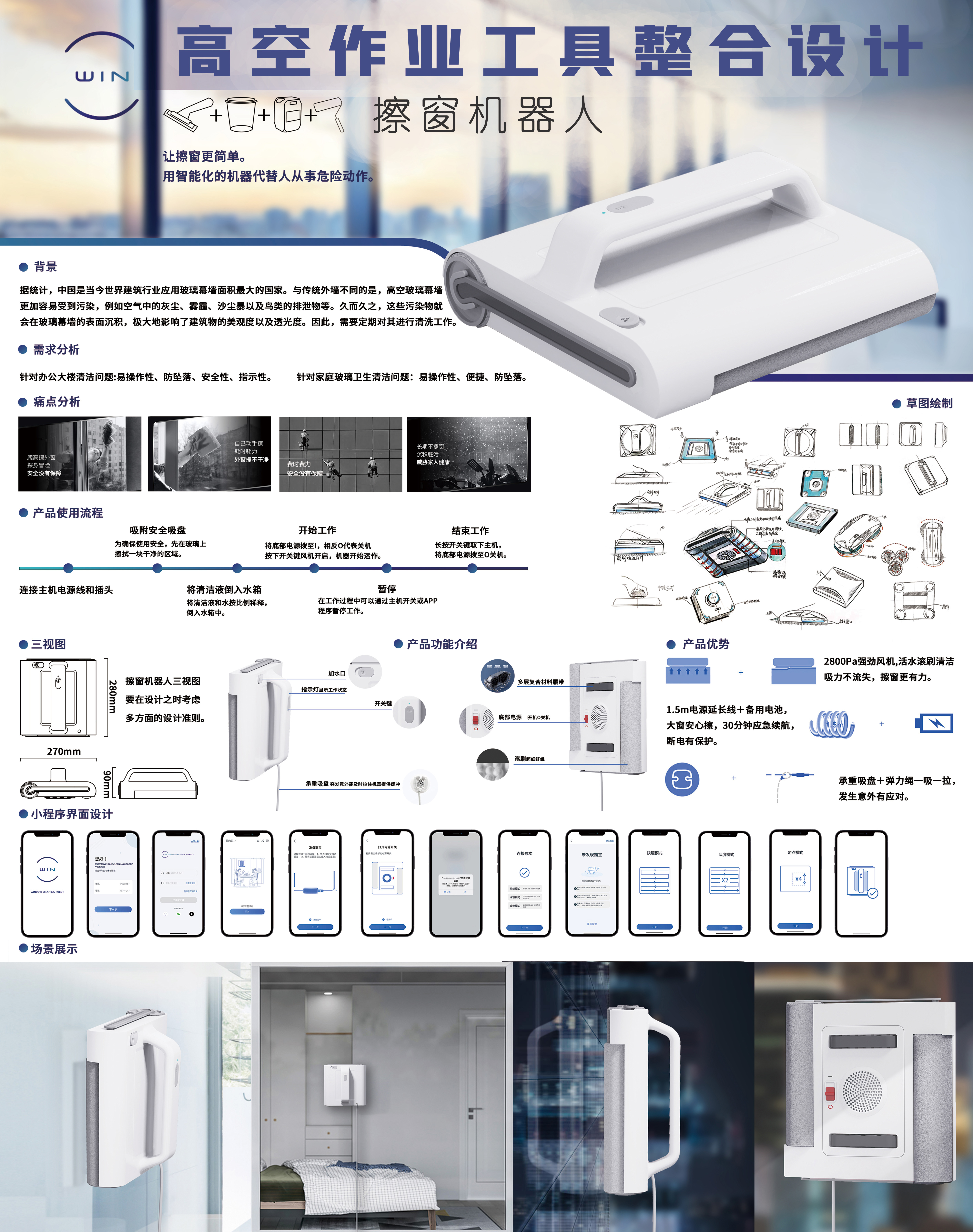 据统计,中国是当今世界建筑行业应用玻璃慕墙面积最大的国家。与传统外墙不同的是,高空玻璃幕更加容易受到污染,例如空气中的灰尘、雾霾、沙尘暴以及鸟类的排泄物等。久而久之,这些污染物会在玻璃幕墙的表面沉积,极大地影响了建筑物的美观度以及透光度。因此,需要定期对其进行清洗。该工具针对办公大楼清洁问题时具有易操作性、防坠落、安全性、指示性,在针对家庭玻璃卫生清洁问题时具有 易操作性、便捷、防坠落。