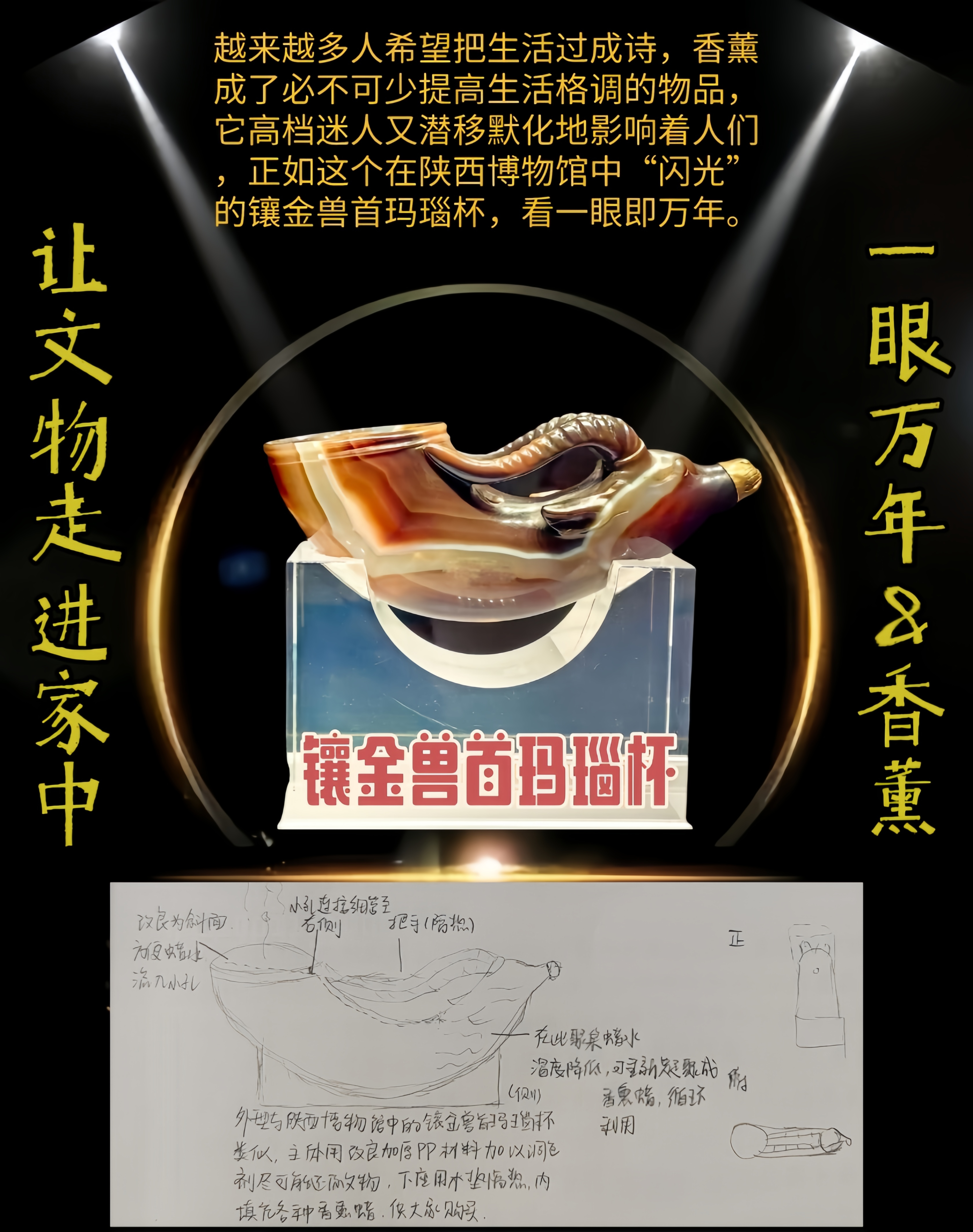 在陕西博物馆看到了这件文物,一眼万年。此兽首玛瑙杯还有一个奇绝之处就是极尽天然和因势造型。这件杯子是用一整块带条纹的缠丝红玛瑙雕刻而成,这块红玛瑙纹理层次分明,色彩纯正,本身就是一件罕见的天然宝石,工匠巧妙地利用玛瑙的材质、颜色和自然纹理,设计出杯子的造型,兽角的雕刻运用玛瑙的天然俏色,上红下白,表现出羊角般的质感。由此与香薰联系起来,高档典雅。