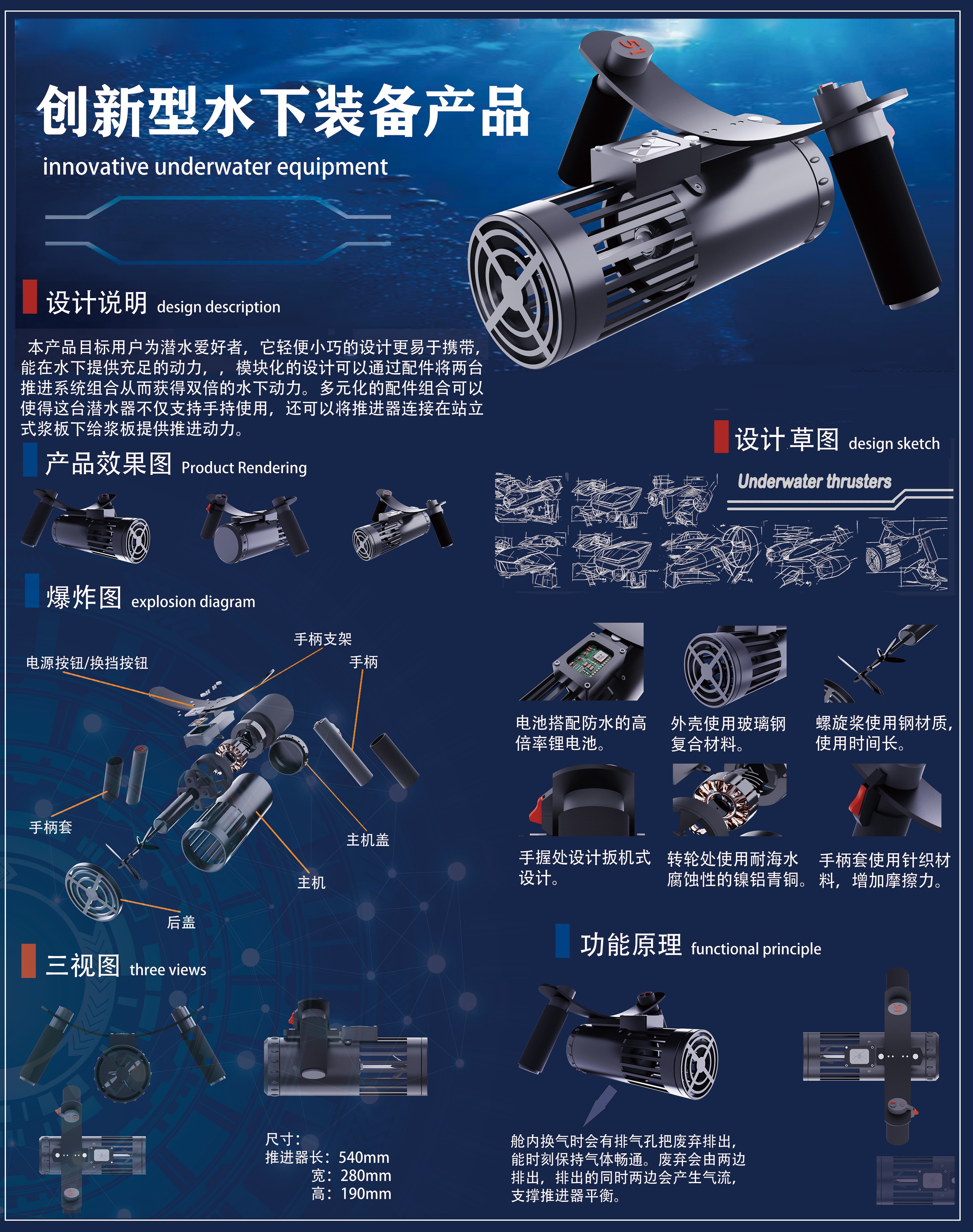 本产品目标用户为潜水爱好者,它轻便小巧的设计更易于携带,能在水下提供充足的动力,,模块化的设计可以通过配件将两台推进系统组合从而获得双倍的水下动力。多元化的配件组合可以使得这台潜水器不仅支持手持使用,还可以将推进器连接在站立式浆板下给浆板提供推进动力。