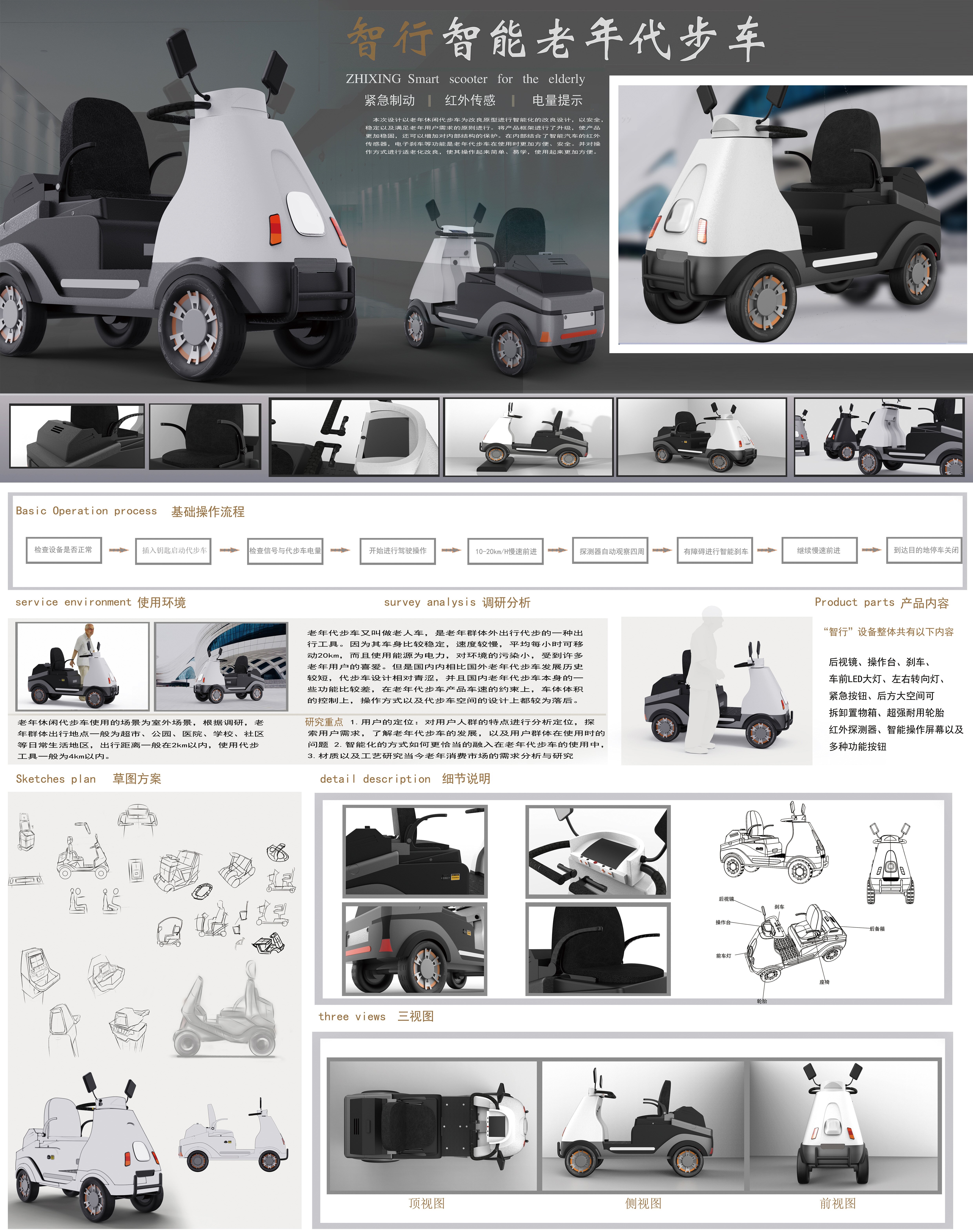 本次设计以老年休闲代步车为改良原型进行智能化的改良设计,以安全,稳定以及满足老年用户需求的原则进行。将产品框架进行了升级,使产品更加稳固,还可以增加对内部结构的保护。在内部结合了智能汽车的红外传感器,电子刹车等功能是老年代步车在使用时更加方便、安全。并对操作方式进行适老化改良,使其操作起来简单、易学,使用起来更加方便。