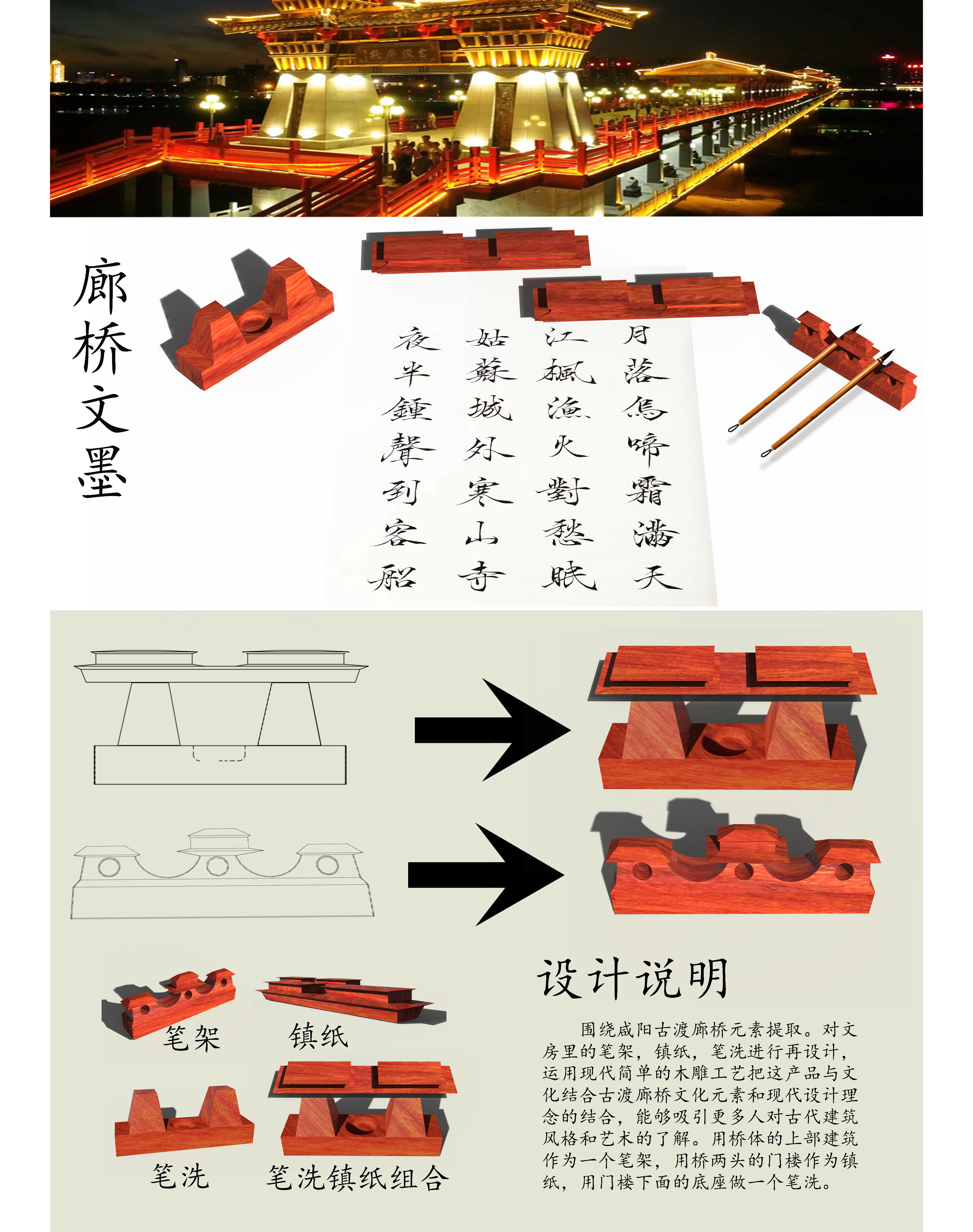 围绕咸阳古渡廊桥元素提取。对文房里的笔架,镇纸,笔洗进行再设计,运用现代简单的木雕工艺把这产品与文化结合古渡廊桥文化元素和现代设计理念的结合,能够吸引更多人对古代建筑风格和艺术的了解。用桥体的上部建筑作为一个笔架,用桥两头的门楼作为镇纸,用门楼下面的底座做一个笔洗。