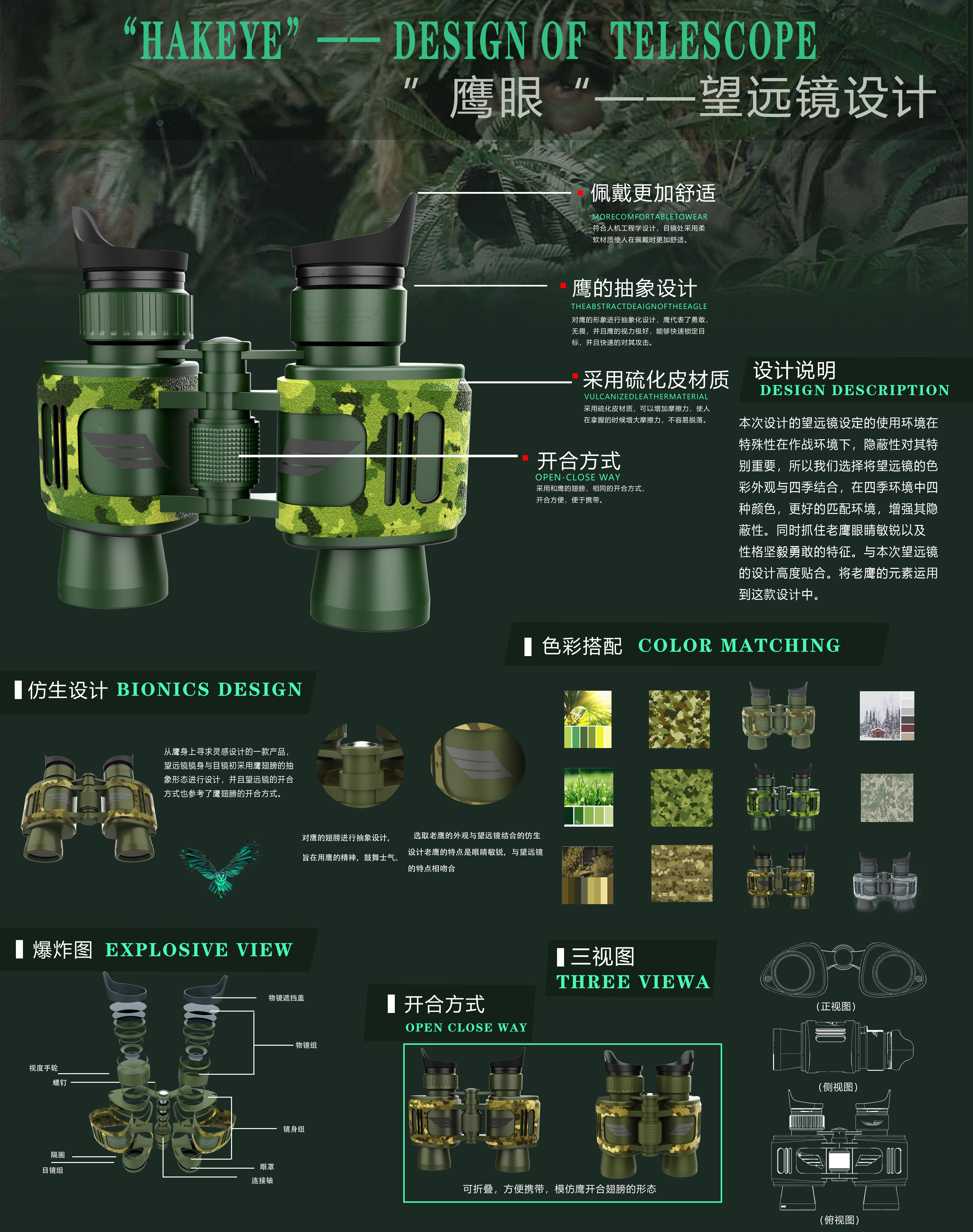 本次设计的望远镜设定的使用环境在特殊性在作战环境下,隐蔽性对其特别重要,所以我们选择将望远镜的色彩外观与四季结合,在四季环境中四种颜色,更好的匹配环境,增强其隐蔽性。同时抓住老鹰眼睛敏锐以及性格坚毅勇敢的特征。与本次望远镜的设计高度贴合。将老鹰的元素运用到这款设计中,赋予这个产品更深层的意义。