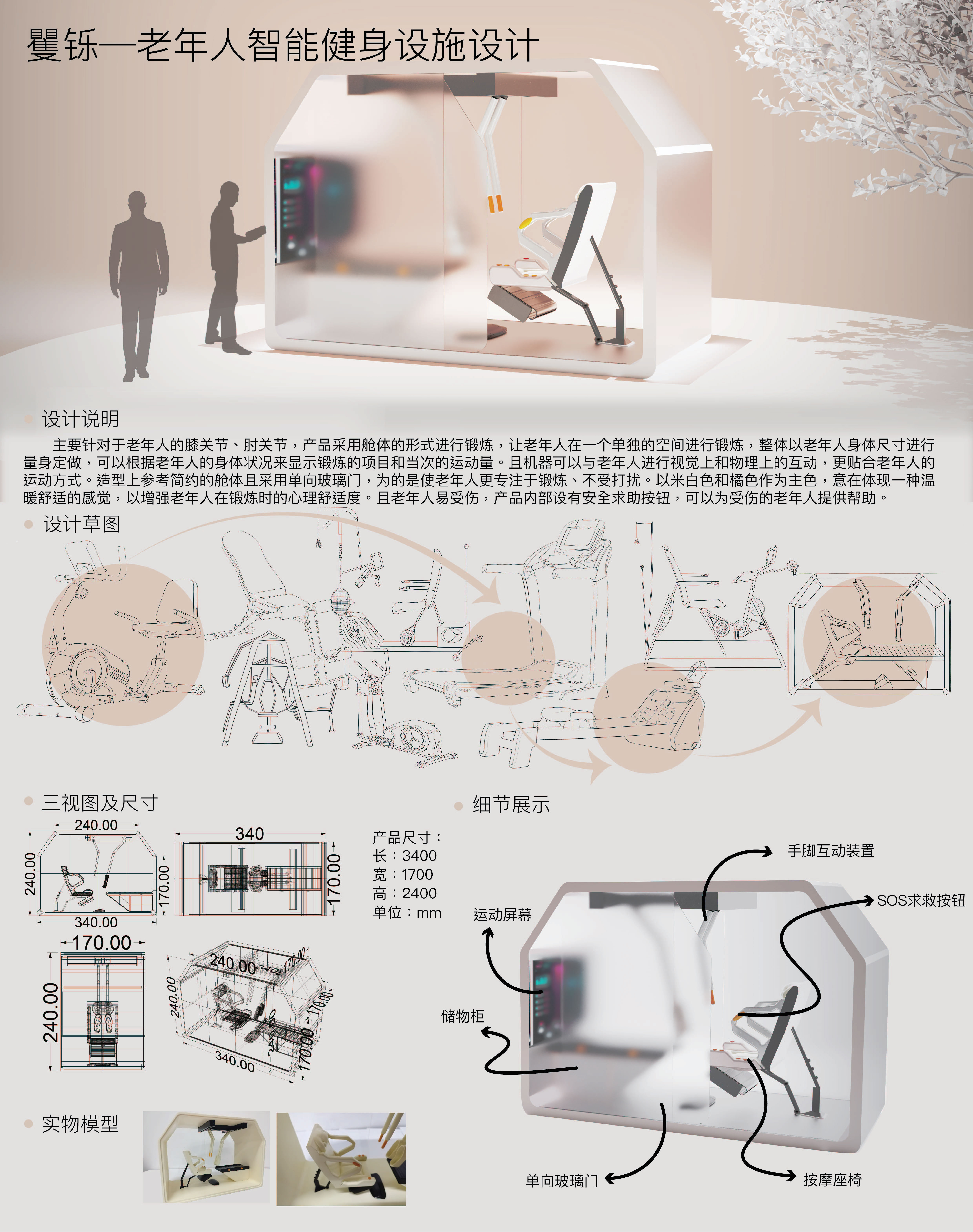 此设计主要针对于老年人的膝关节和肘关节,产品采用舱体的形式进行锻炼,让老年人在一个单独的空间进行锻炼,实现机器与人的情感互动,整体以老年人身体尺寸进行量身定做,并且带有AR视觉以及各种辅佐老年人附属功能。