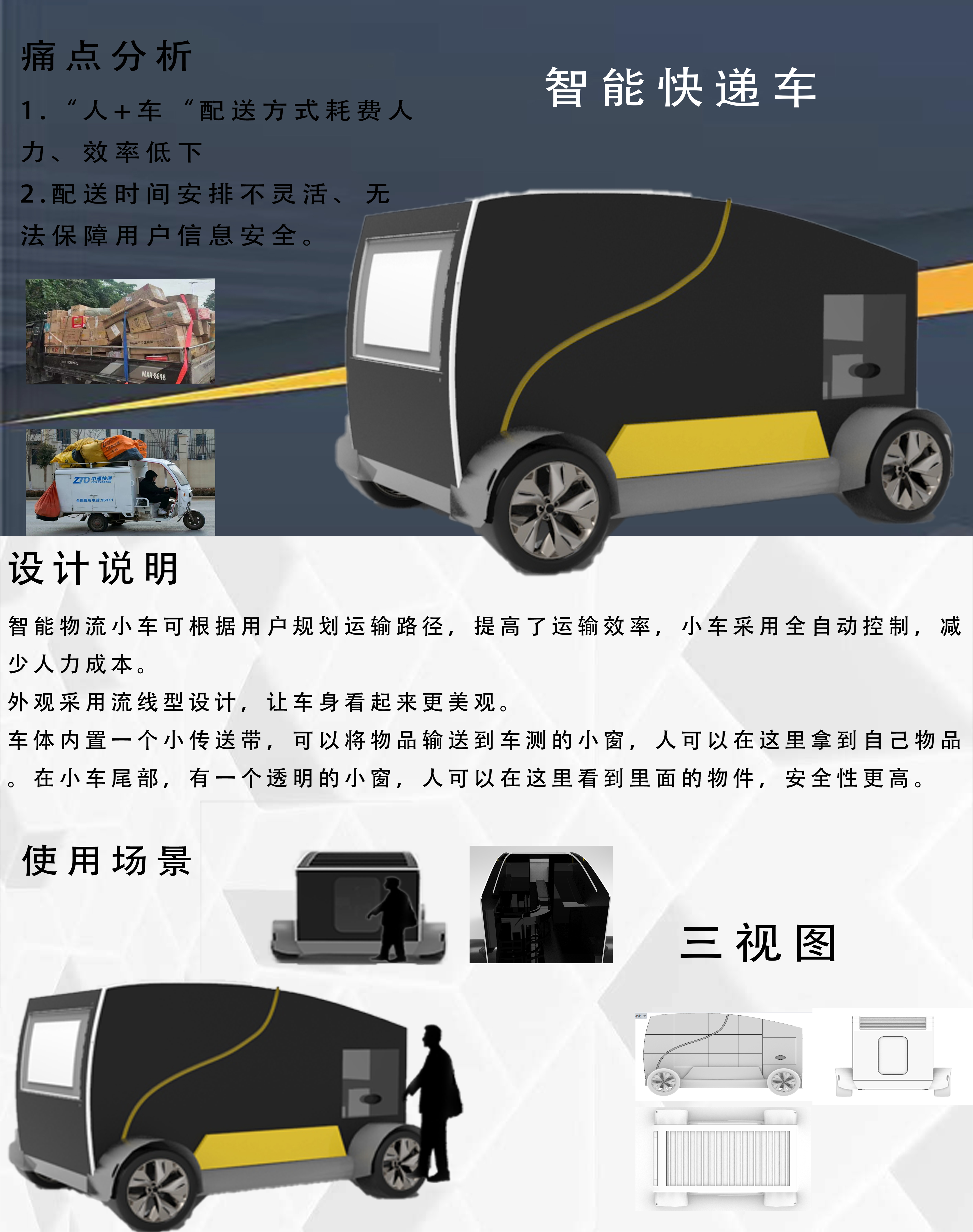 1.智能物流小车可根据用户规划运输路径,提高了运输效率,小车采用全自动控制,减少人力成本。 2.外观采用流线型设计,让车身看起来更美观。 3.车体内置一个小传送带,可以将物品输送到车测的小窗,人可以在这里拿到自己物品。在小车尾部,有一个透明的小窗,人可以在这里看到里面的物件,安全性更高。