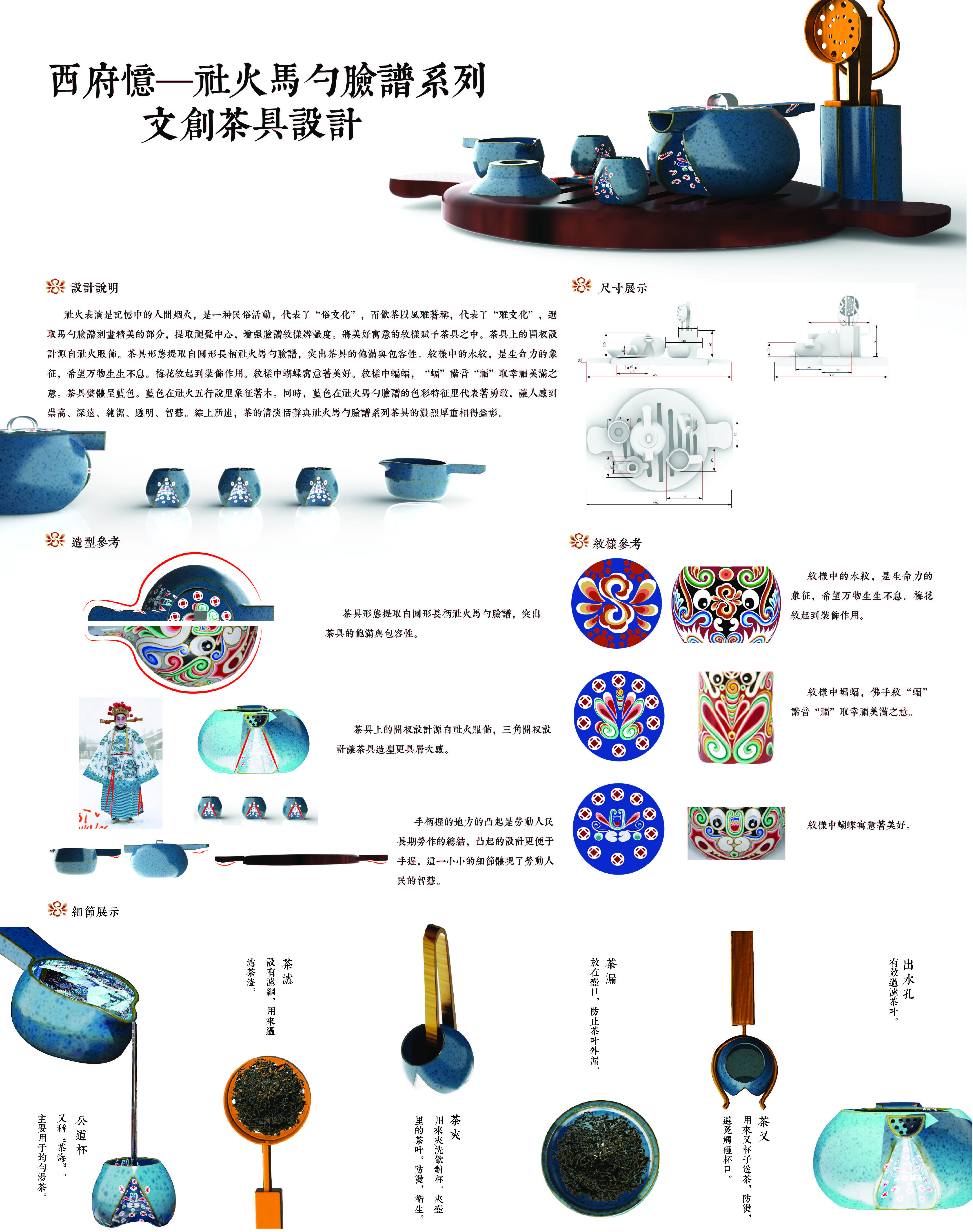 社火表演是记忆中的人间烟火,是一种民俗活动,代表了“俗文化”,而饮茶以风雅著称,代表了“雅文化”,选取马勺脸谱刻画精美的部分,提取视觉中心,增强脸谱纹样辨识度,将美好寓意的纹样赋予茶具之中。茶具上的开衩设计源自社火服饰。茶具形态提取自圆形长柄社火马勺脸谱,突出茶具的饱满与包容性。茶具整体呈蓝色。蓝色在社火马勺脸谱的色彩特征里代表着勇敢,让人感到崇高、深远、纯洁、透明、智慧。