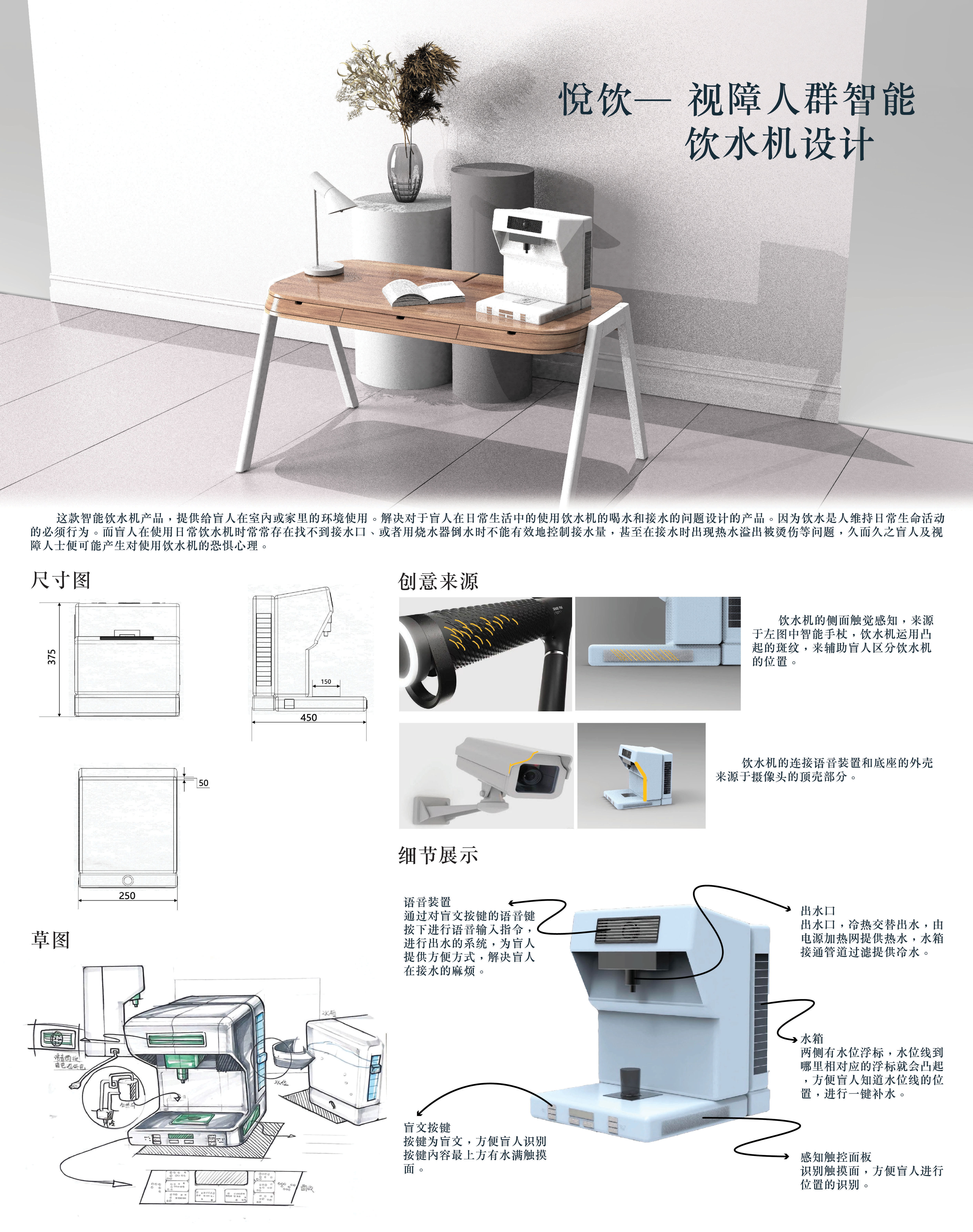 这款智能饮水机产品,提供给盲人在室内或家里的环境使用。解决对于盲人在日常生活中的使用饮水机的喝水和接水的问题设计的产品。因为饮水是人维持日常生命活动的必须行为。而盲人在使用日常饮水机时常常存在找不到接水口、或者用烧水器倒水时不能有效地控制接水量,甚至在接水时出现热水溢出被烫伤等问题,久而久之盲人及视障人士便可能产生对使用饮水机的恐惧心理。
