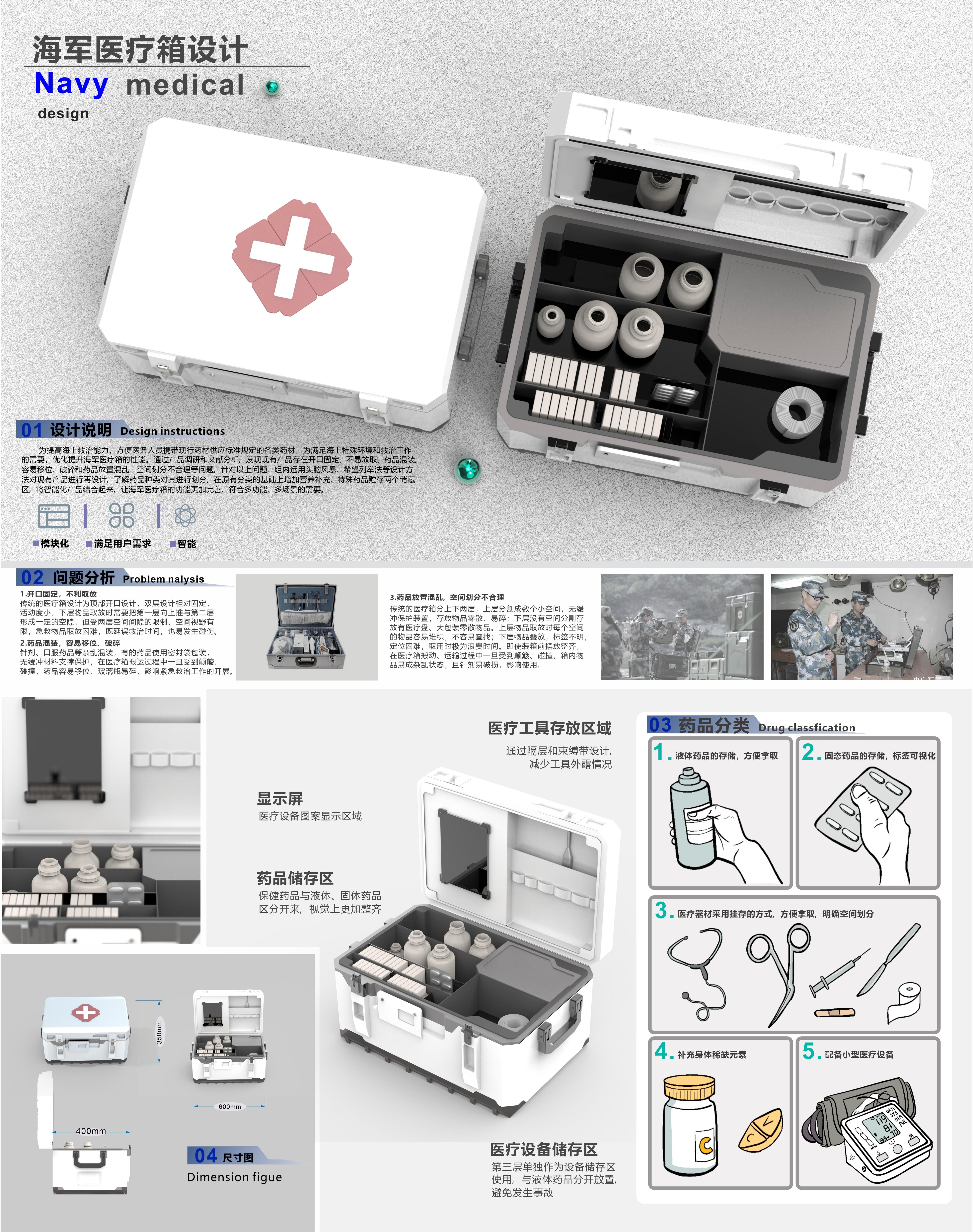 为提高海上救治能力与满足海上特殊环境的需要,进行海军医疗箱优化设计。通过产品调研和文献分析,发现现有产品存在不易放取、破碎和药品放置混乱、空间划分不合理等问题,针对以上问题,组内运用头脑风暴、希望列举法等设计方法进行方案构思,了解药品种类对其进行划分,在原有分类的基础上增加营养补充、特殊药品贮存两个储藏区,与智能化产品结合起来信息化存储药品,让海军医疗箱的功能更加完善,符合多功能、多场景的需要。