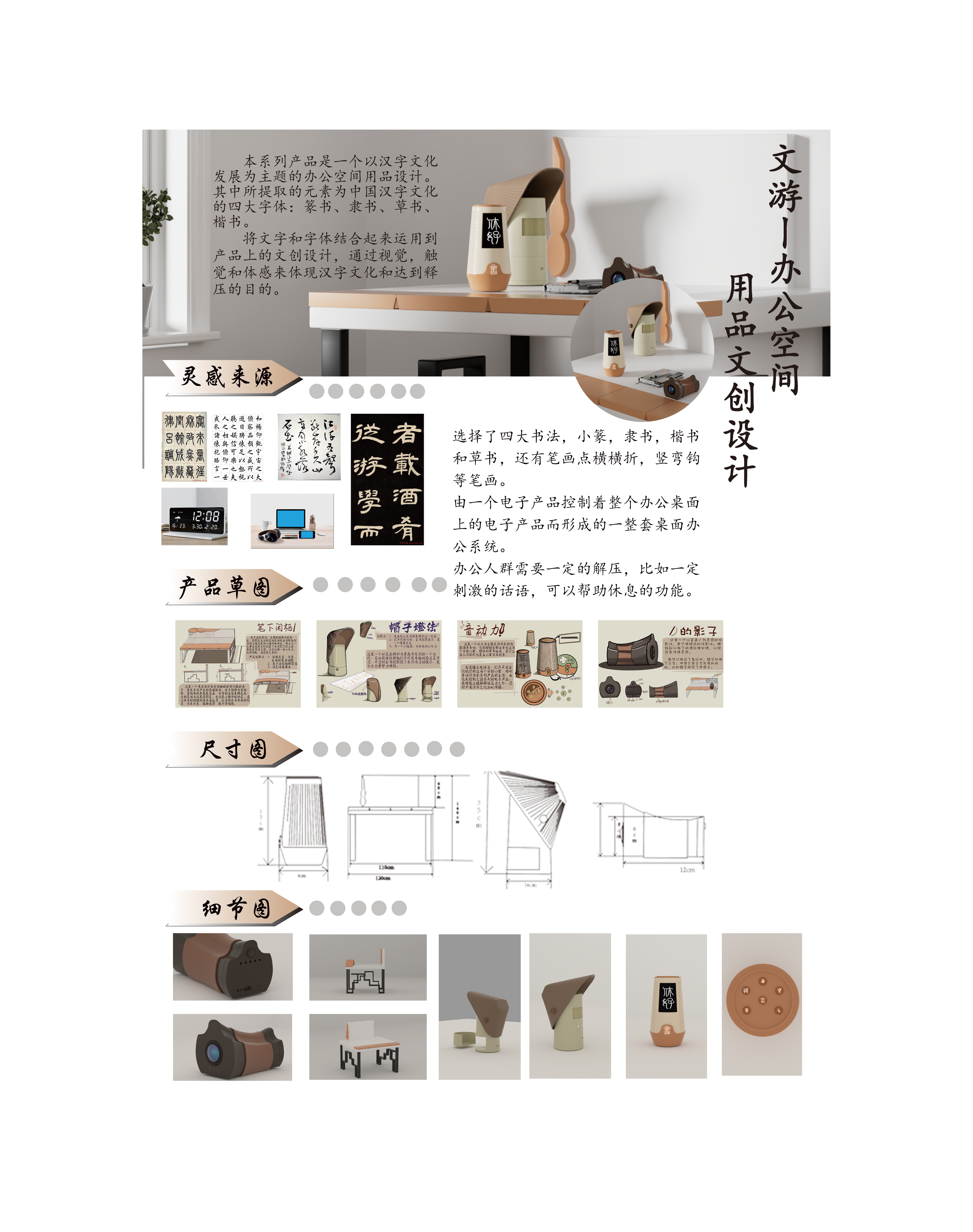 本系列产品是一个以汉字文化发展为主题的办公空间用品设计。其中所提取的元素为中国汉字文化的四大字体:篆书、隶书、草书、楷书。 将文字和字体结合起来运用到产品上的文创设计,通过视觉,触觉和体感来体现汉字文化和达到释压的目的。