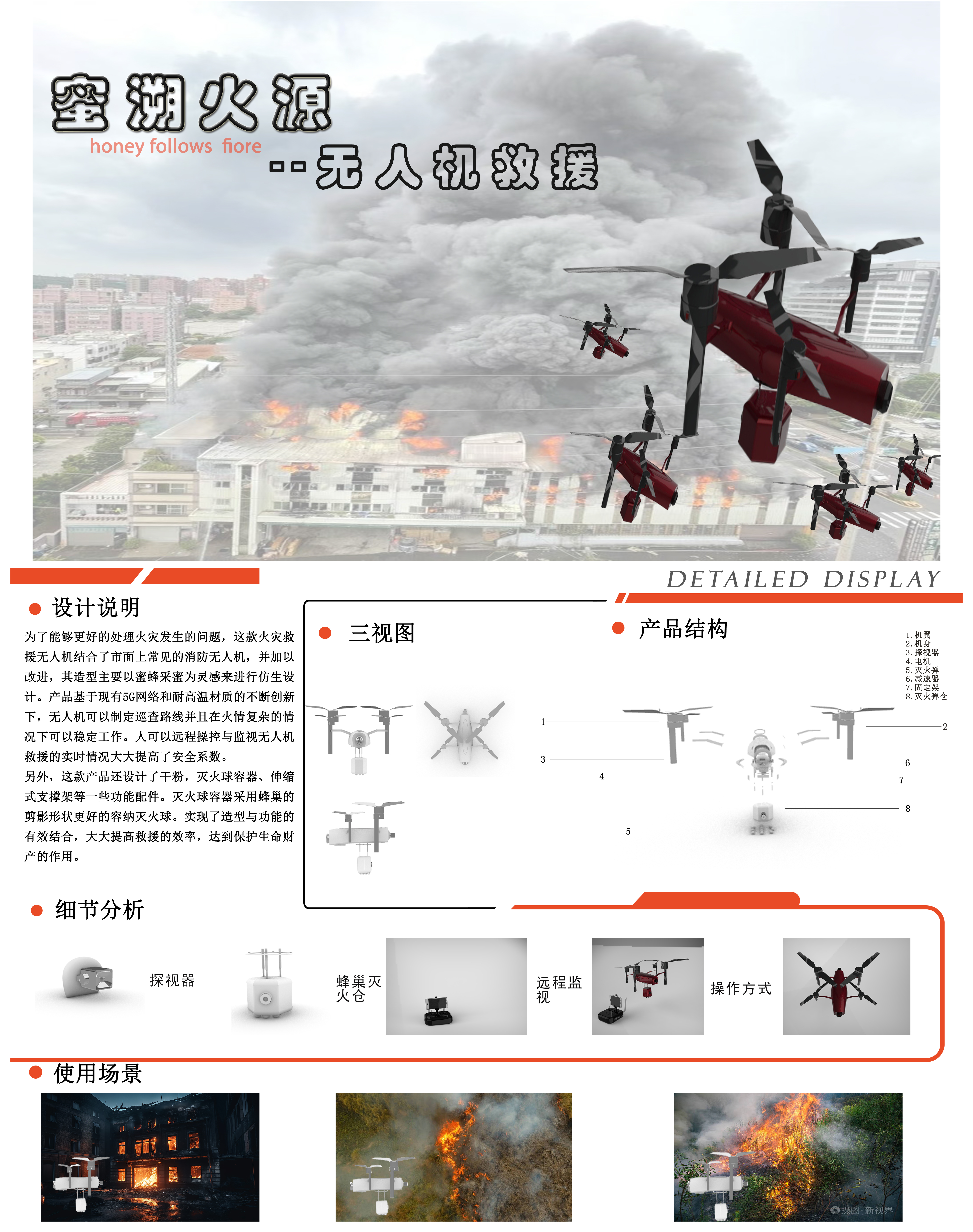 这款火灾救援无人机结合了市面上常见的消防无人机,并加以改进,其造型主要以蜜蜂采蜜为灵感来进行仿生设计。产品基于现有5G网络和耐高温材质的不断创新下,无人机可以制定巡查路线并且在火情复杂的情况下可以稳定工作。这款产品设计干粉,灭火球容器、伸缩式支撑架等一些功能配件。灭火球容器采用蜂巢的剪影形状更好的容纳灭火球。实现了造型与功能的有效结合,大大提高救援的效率,达到保护生命财产的作用。