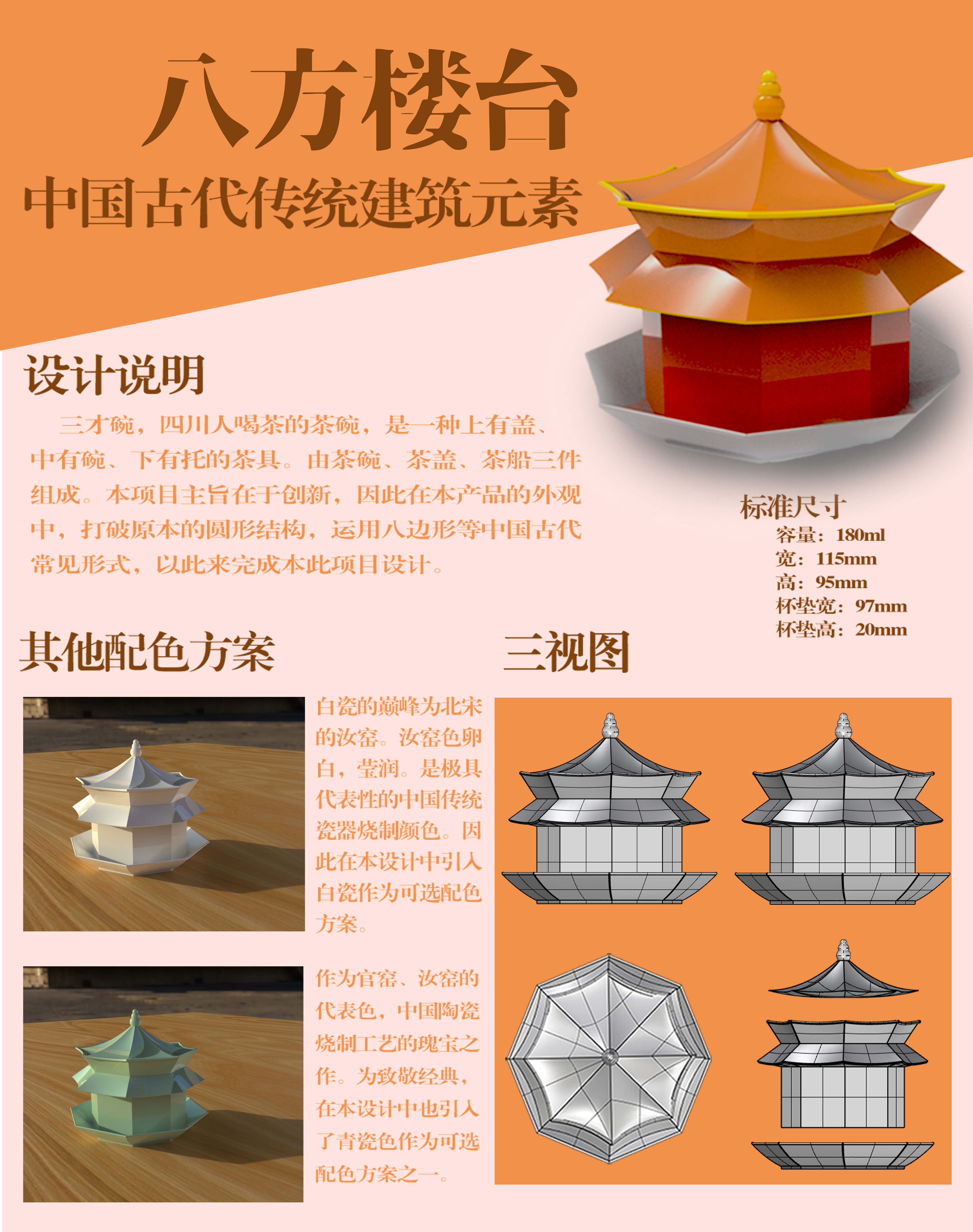 陶瓷是中国传统文化的重要象征之一,其质地、形状和色彩等都蕴含着深远的历史文化底蕴。《八方楼台》的设计从中国传统茶文化中汲取灵感,通过运用陶瓷工艺和装饰手法,将传统文化元素与现代设计理念相结合,使茶杯成为传承与展示中国文化的载体。