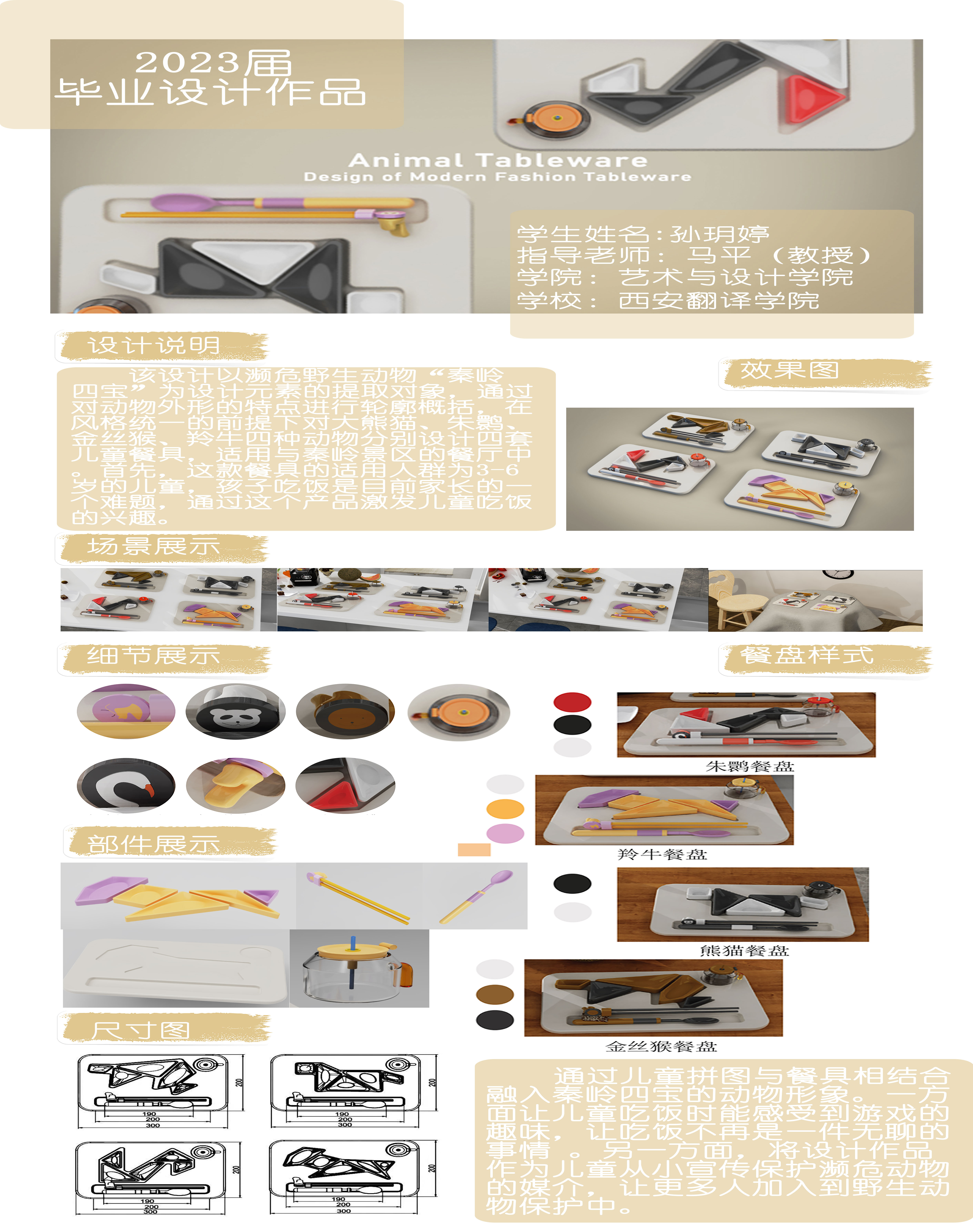 该设计以濒危野生动物“秦岭四宝”为设计元素的提取对象,通过对动物外形的特点进行轮廓概括,在风格统一的前提下对大熊猫、朱鹮、金丝猴、羚牛四种动物分别设计四套儿童餐具,适用与秦岭景区的餐厅中。通过儿童拼图与餐具相结合融入秦岭四宝的动物形象。一方面让儿童吃饭时能感受到游戏的趣味,让吃饭不再是一件无聊的事情 。另一方面,将其作为儿童从小宣传保护濒危动物的媒介,让更多人加入到野生动物保护中。