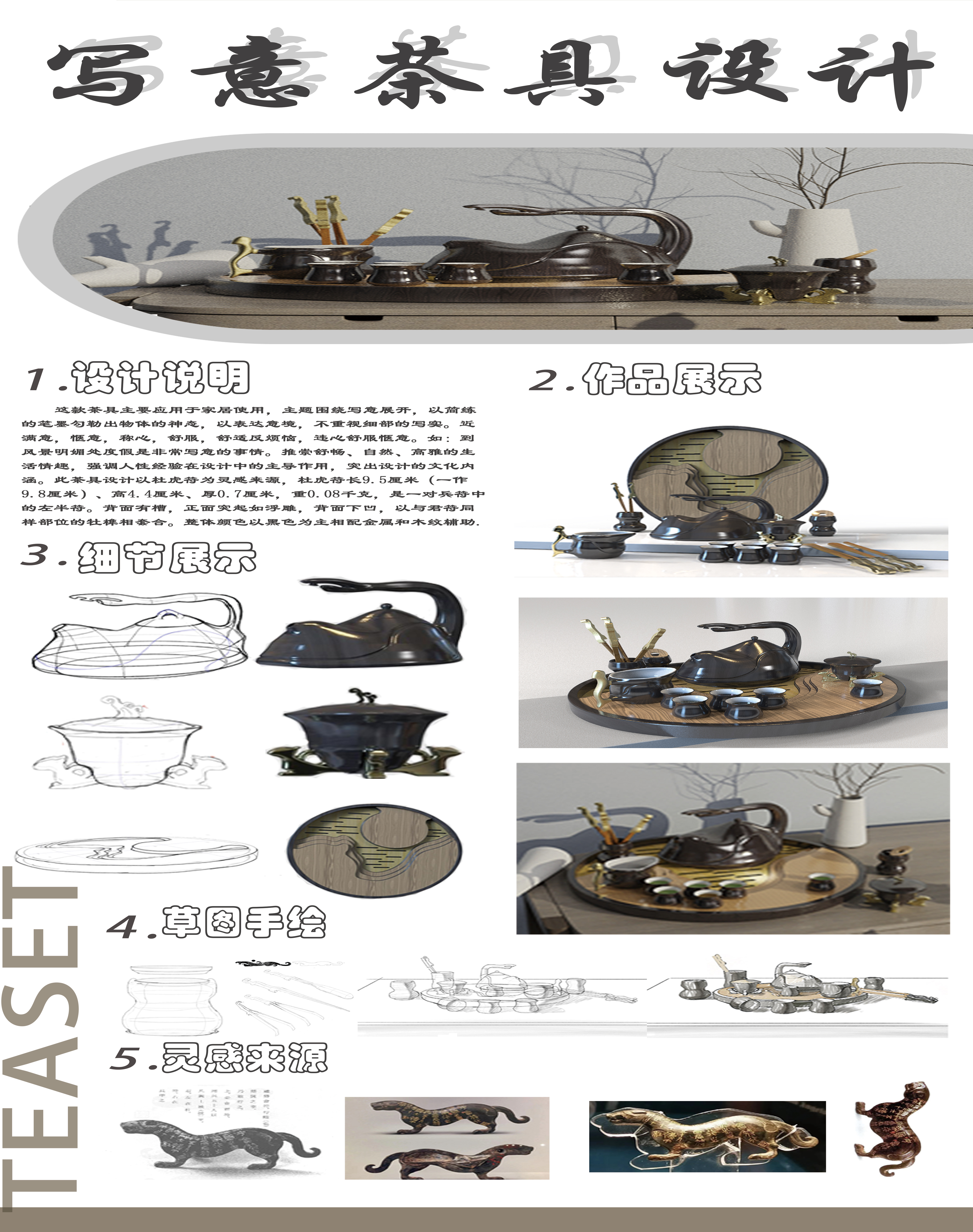 这款茶具主要应用于家居使用,主题围绕写意展开,以简练的笔墨勾勒出物体的神态,以表达意境,不重视细部的写实。近满意,惬意,称心,舒服,舒适反烦恼,违心舒服惬意。如:到风景明媚处度假是非常写意的事情。推崇舒畅、自然、高雅的生活情趣,强调人性经验在设计中的主导作用,突出设计的文化内涵。