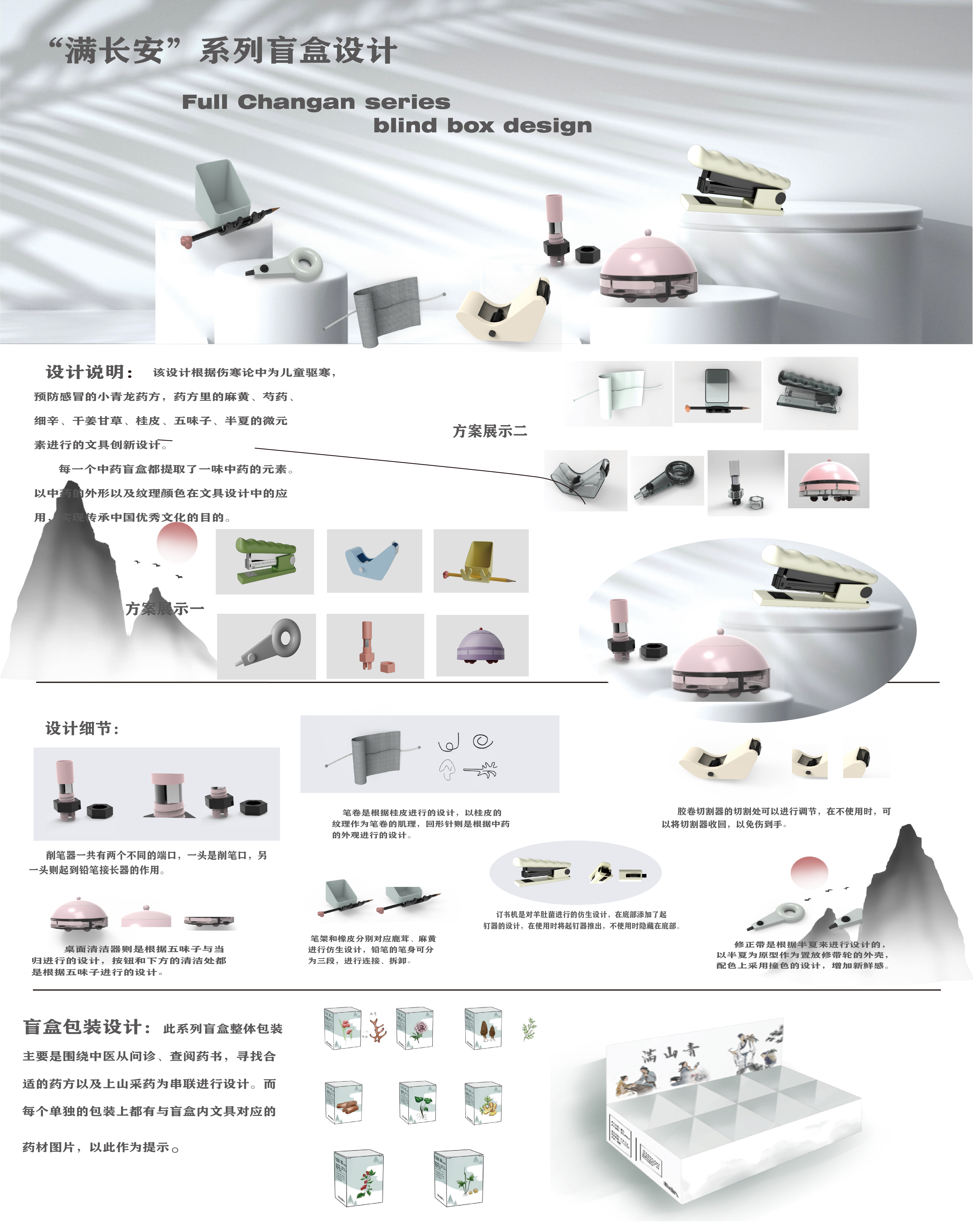 该设计根据伤寒论中为儿童驱寒,预防感冒的小青龙药方,药方里的麻黄、芍药、细辛、干姜甘草、桂皮、五味子、半夏的微元素进行的文具创新设计。 每一个中药盲盒都提取了一味中药的元素。以中药的外形以及纹理颜色在文具设计中的应用,实现传承中国优秀文化的目的。
