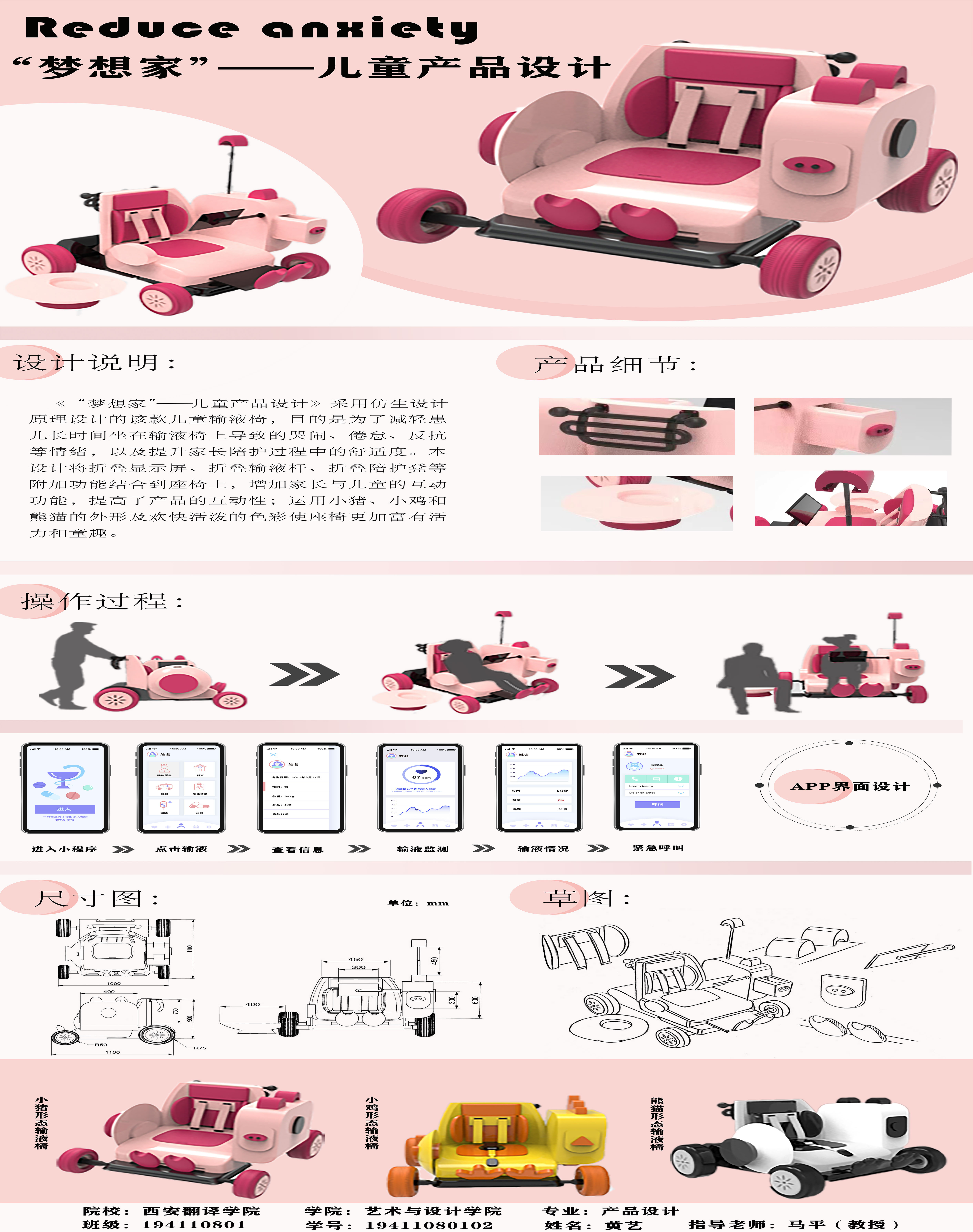 《“梦想家” 儿童产品设计》采用仿生设计原理设计的该款儿童输液椅,目的是为了减轻患儿长时间坐在输液椅上导致的哭闹、倦怠、反抗等情绪,以及提升家长陪护过程中的舒适度。本设计将折叠显示屏、折叠输液杆、折叠陪护凳等附加功能结合到座椅上,增加家长与儿童的互动功能,提高了产品的互动性;运用小猪、小鸡和熊猫的外形及欢快活泼的色彩使座椅更加富有活力和童趣。