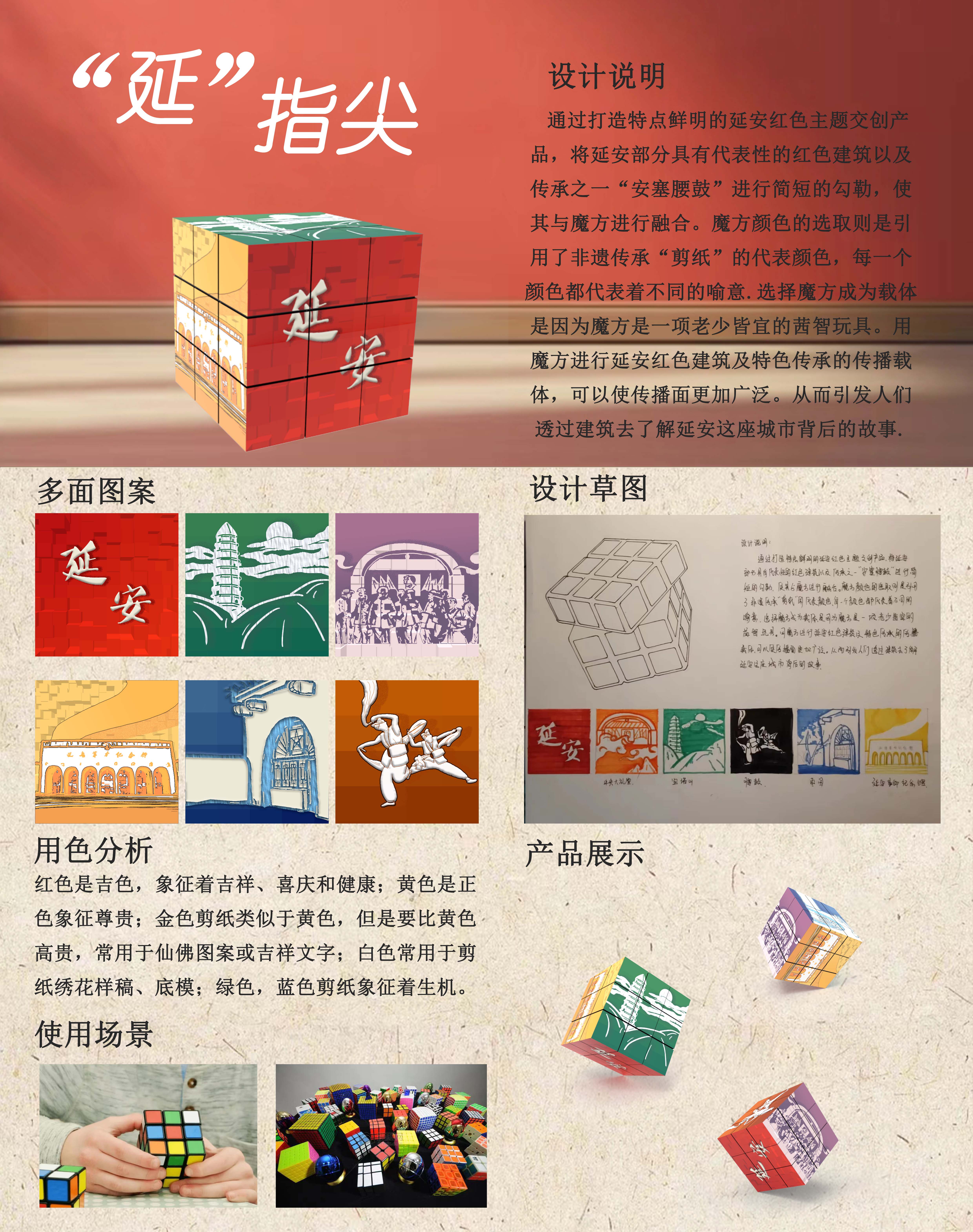 通过打造特点鲜明的延安红色主题交创产品,将延安部分具有代表性的红色建筑以及传承之一“安塞腰鼓”进行简短的勾勒,使其与魔方进行融合。魔方颜色的选取则是弓用了非遗传承“剪纸”的代表颜色,每一个颜色都代表着不同的喻意.选择魔方成为载体是因为魔方是一项老少皆宜的茜智玩具。用魔方进行延安红色建筑及特色传承的传播载体,可以使传播面更加广泛,从而引发人们透过建筑去了解延安这座城市背后的故事.