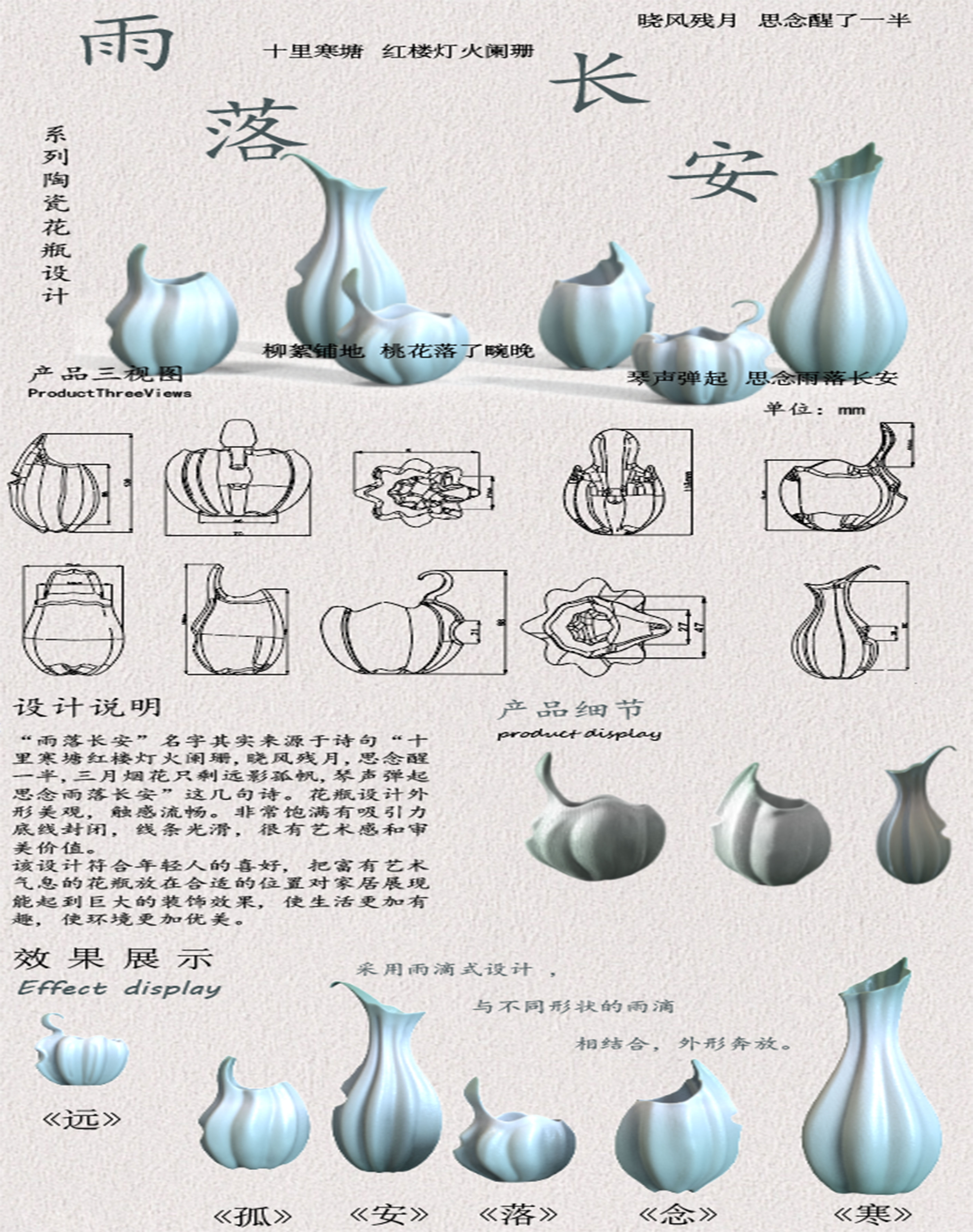 “雨落长安”名字其实来源于诗句“十里寒塘红楼灯火阑珊,晓风残月,思念醒一半,三月烟花只剩远影孤帆,琴声弹起思念雨落长安”这几句诗。花瓶设计外形美观,触感流畅。非常饱满有吸引力底线封闭,线条光滑,很有艺术感和审美价值。该设计符合年轻人的喜好,把富有艺术气息的花瓶放在合造的位置对家居展现能起到巨大的装饰效果,使生活更加有趣,使环境更加优美。
