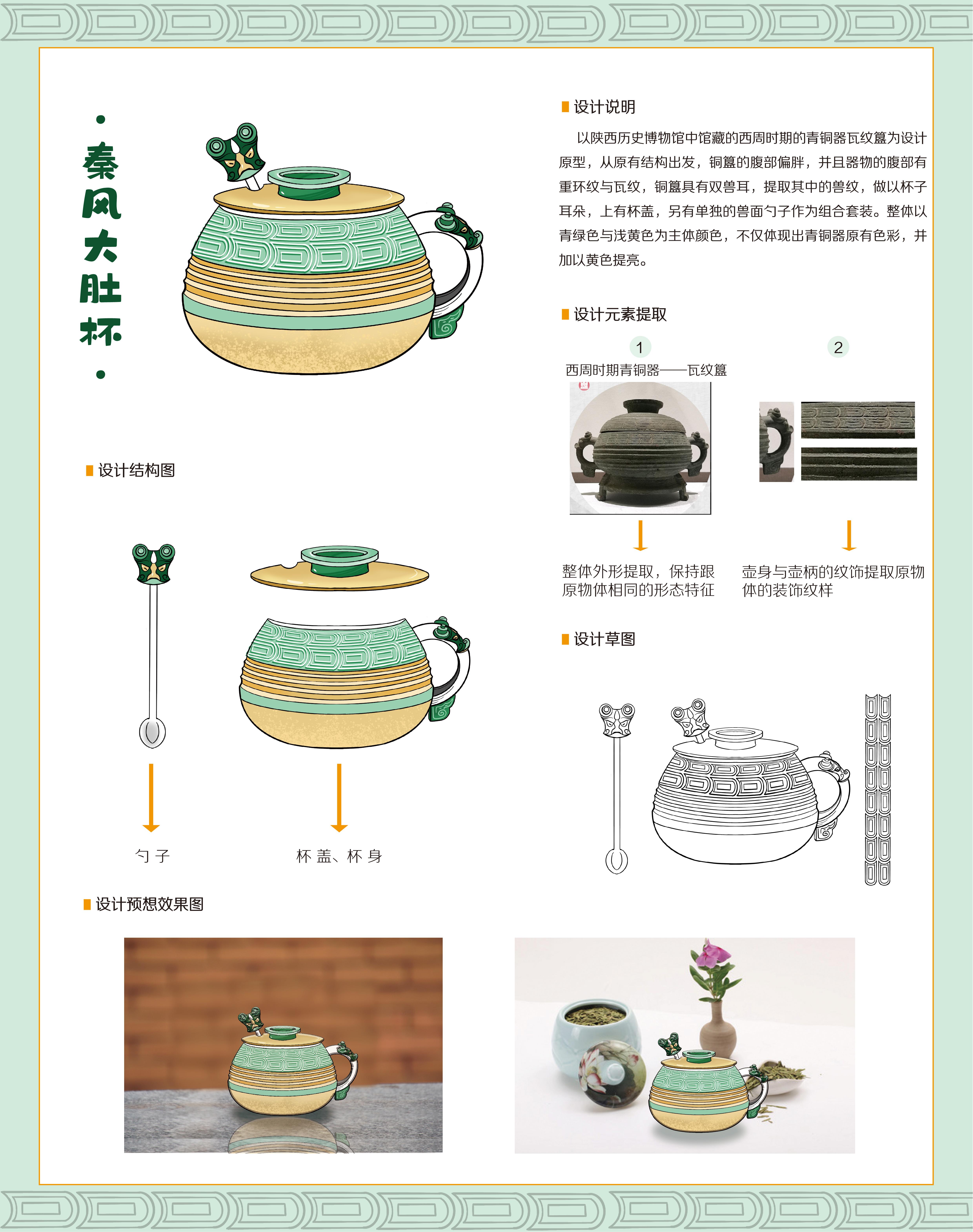 以陕西历史博物馆中馆藏的西周时期的青铜器瓦纹簋为设计原型,从原有结构出发,铜簋的腹部偏胖,并且器物的腹部有重环纹与瓦纹,铜簋具有双兽耳,提取其中的兽纹,做以杯子耳朵,上有杯盖,另有单独的兽面勺子作为组合套装。整体以青绿色与浅黄色为主体颜色,不仅体现出青铜器原有色彩,并加以黄色提亮。