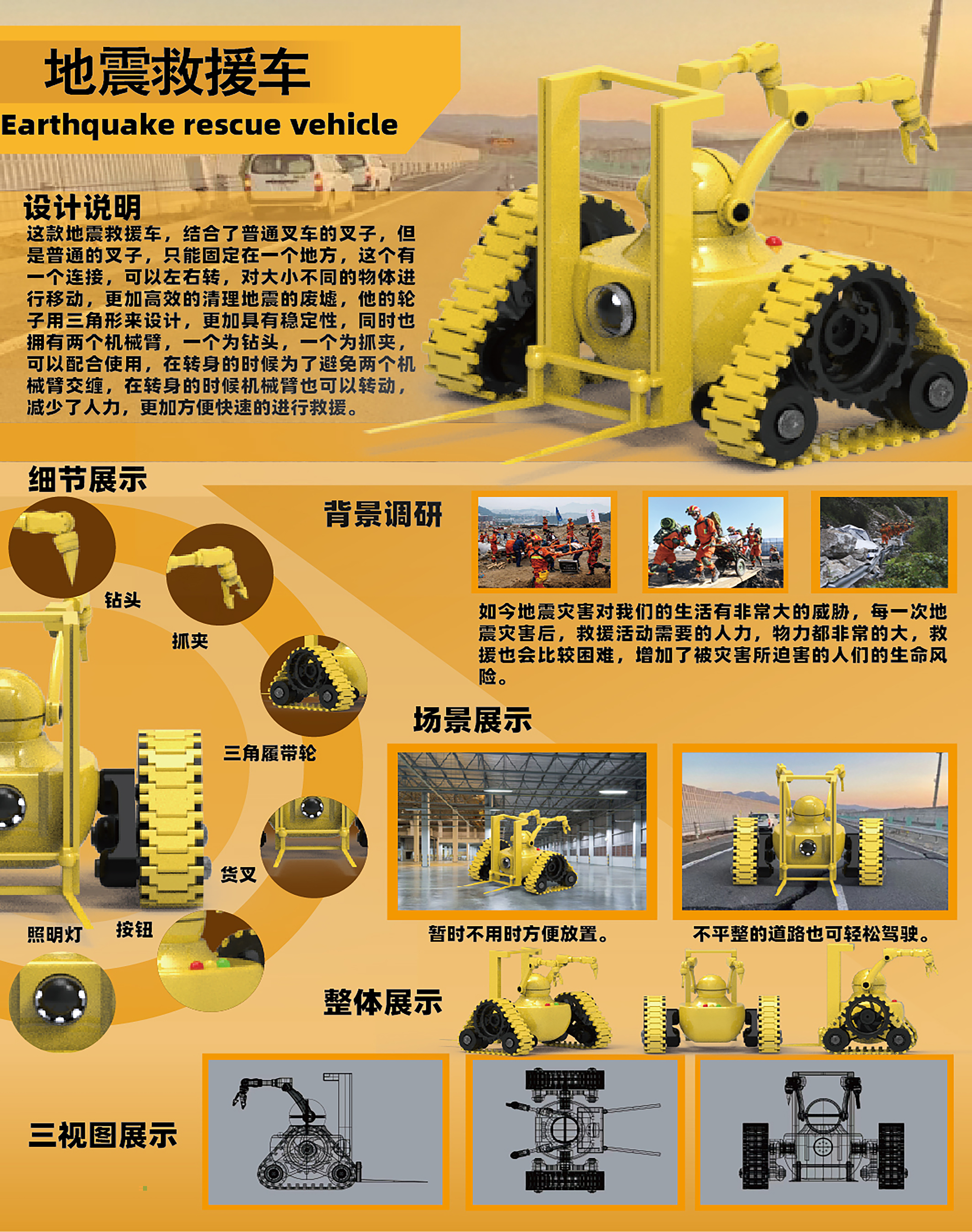 这款地震救援车,结合了普通叉车的叉子,但是普通的叉子,只能固定在一个地方,这个有一个连接,可以左右转,对大小不同的物体进行移动,更加高效的清理地震的废墟,他的轮子用三角形来设计,更加具有稳定性,同时也拥有两个机械臂,一个为钻头,一个为抓夹,可以配合使用,在转身的时候为了避免两个机械臂交缠,在转身的时候机械臂也可以转动,减少了人力,更加方便快速的进行救援。