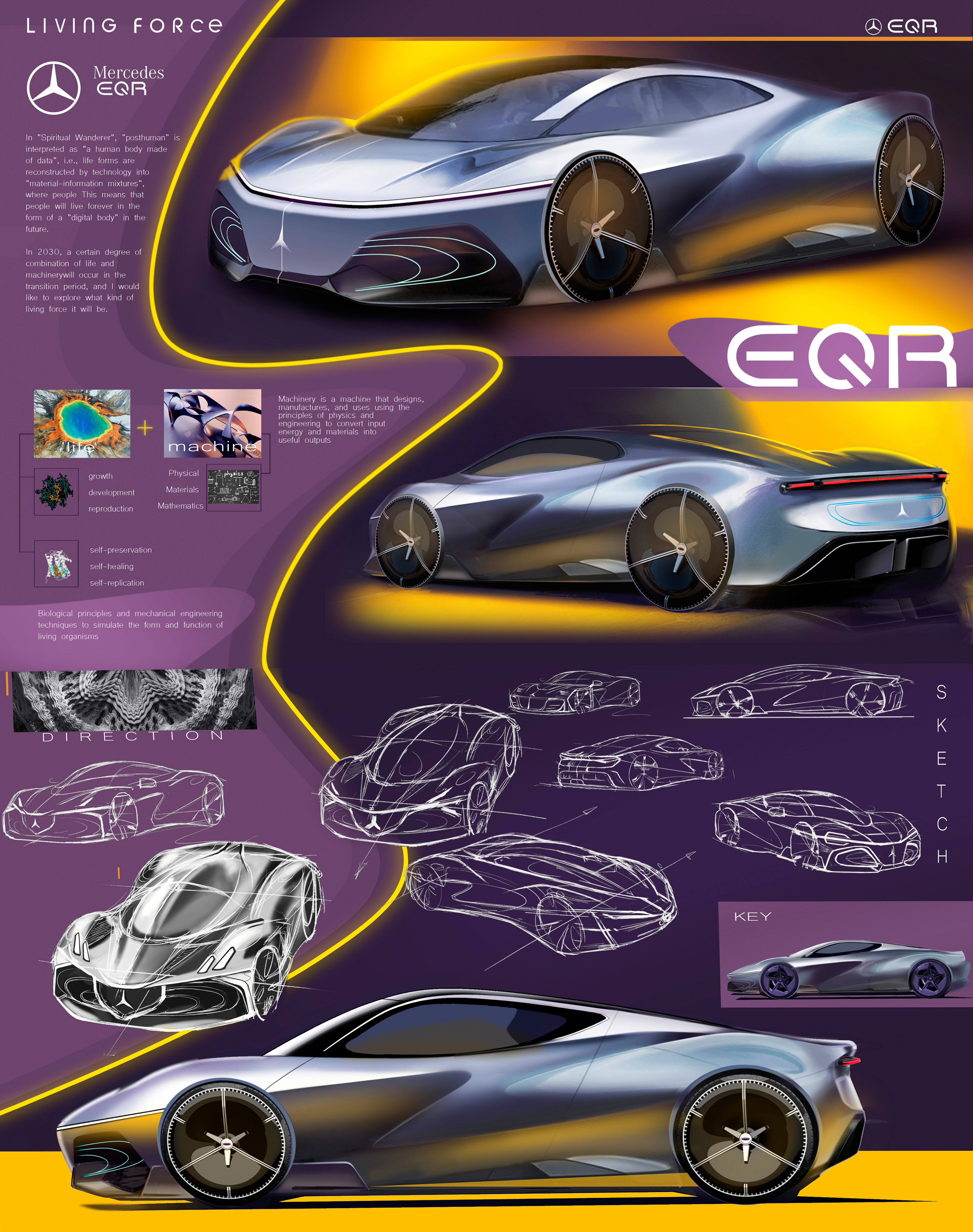 “后人类”在《精神流浪者》一书中被解释为——由数据构成的人体”即生命形式被技术重构为“物质-信息混合体”,人在其中生活。这意味着未来人将以“数字身体”的形式永生。2030年,在过渡期会出现一定程度的生命与机械的结合,汽车将会模拟生物体的形态和功能,依据生物学原理和机械工程技术展示出全新的外观。