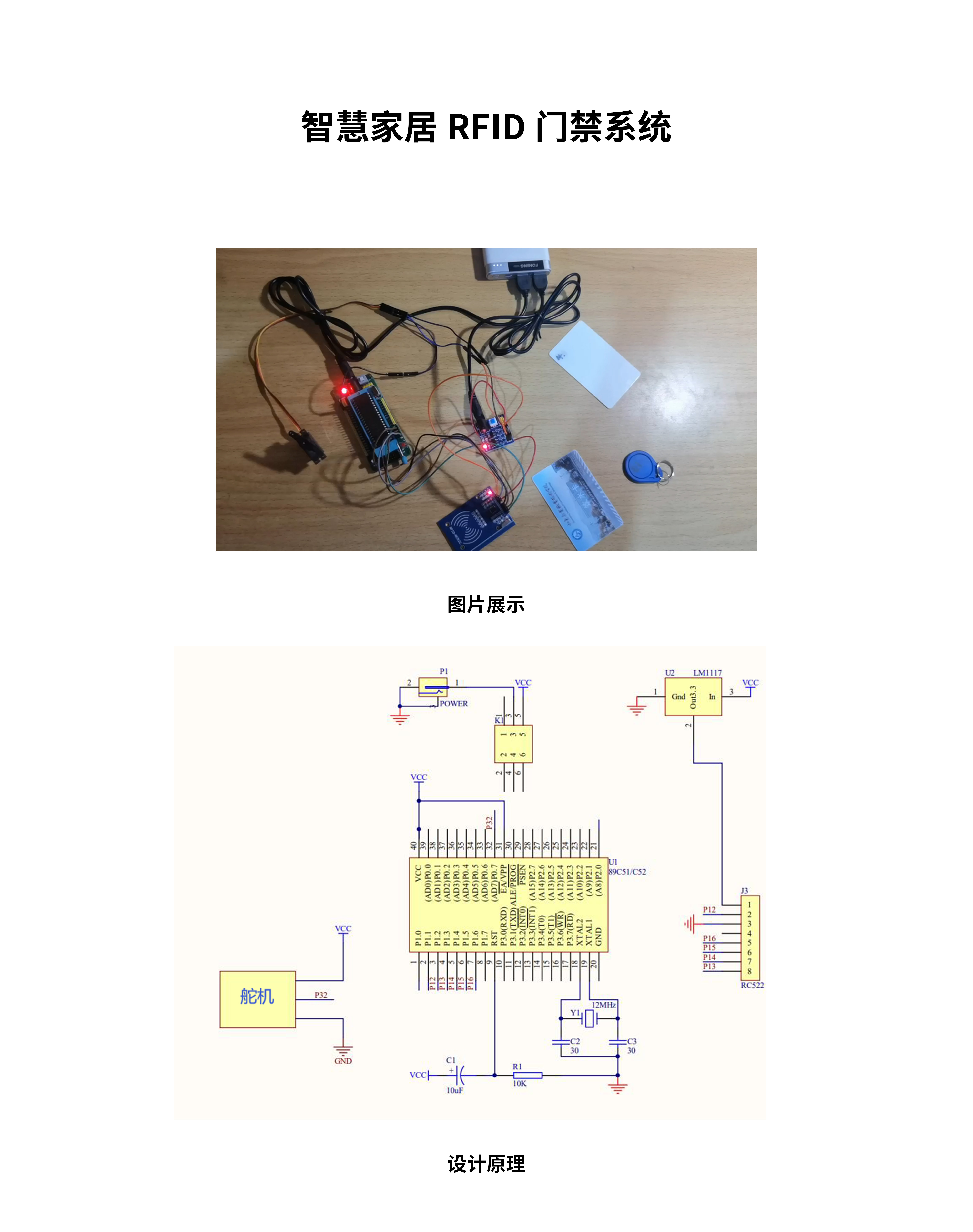 传统门锁在钥匙丢失或忘记携带时,只能从窗户进入或者采取破坏门锁的办法开锁。尤其在出租房屋业务中,由于经常换租客,传统门锁因为可以随意复制,安全系数低。针对这些问题提出了智慧家居RFID门禁系统。智慧家居RFID门禁系统的工作原理是当有射频卡靠近时,射频模块RC522接收到信号,舵机牵引门锁;当卡离开,舵机就会复位,关闭门锁,等待下一次开锁。