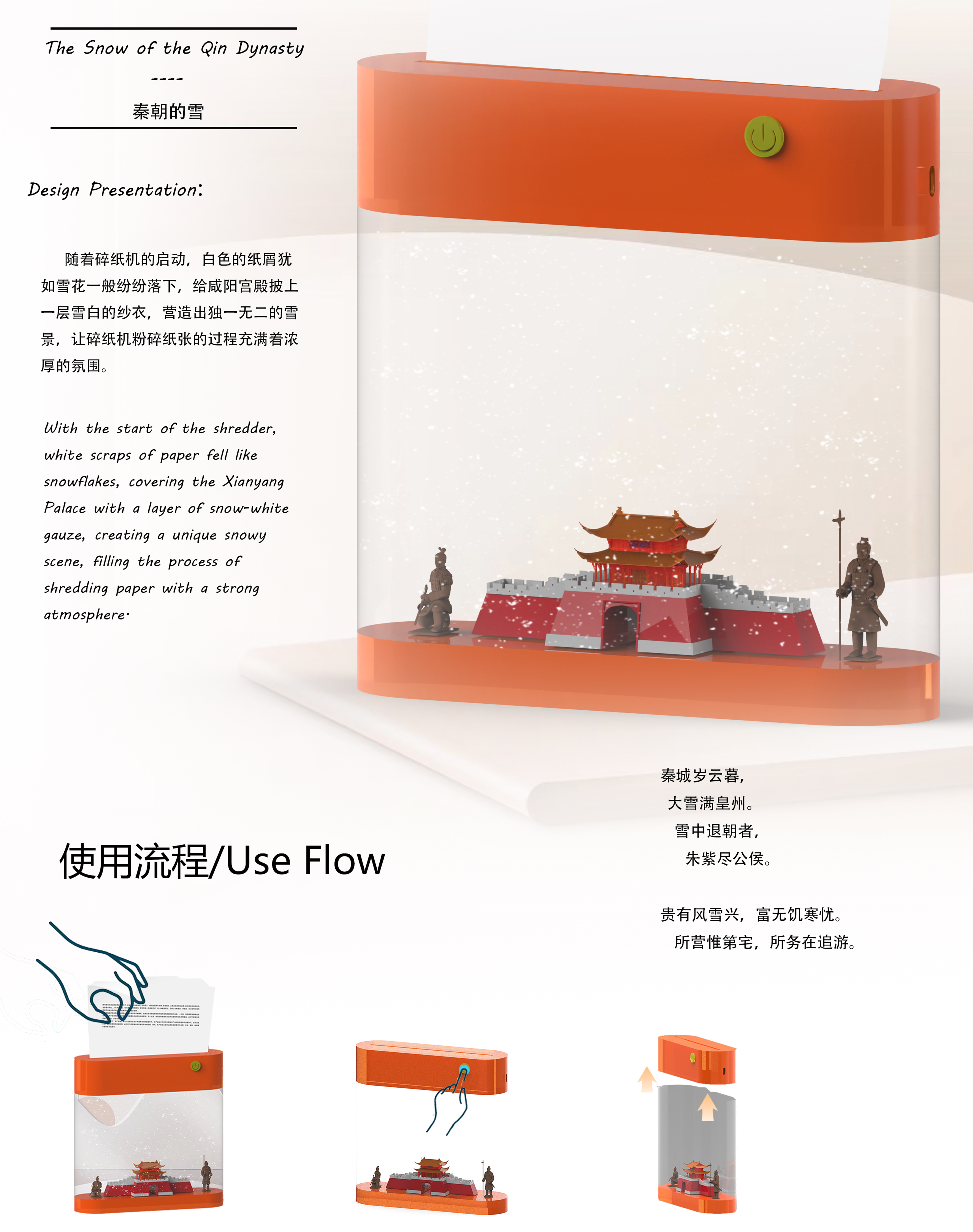 本产品打破了碎纸机原来拥有的造型和格调,在创作的过程中加入西安的历史人物,富有极具特色的历史文化,给人们一种清新的感觉,让人们在工作的过程中不再枯燥。闲暇之余观看纸张进入碎纸机被搅碎,化为纸屑纷纷落下,犹如漫天大雪,为下方的咸阳宫和宫殿旁边站立的两座兵马俑披上雪白的外衣。让人们不禁能够联想到当年的秦朝下雪时的场景。让人们仿佛身临其境。浩大的宫殿,众多的将士,漫天飞雪,无一不在昭示着当年秦朝的强盛。