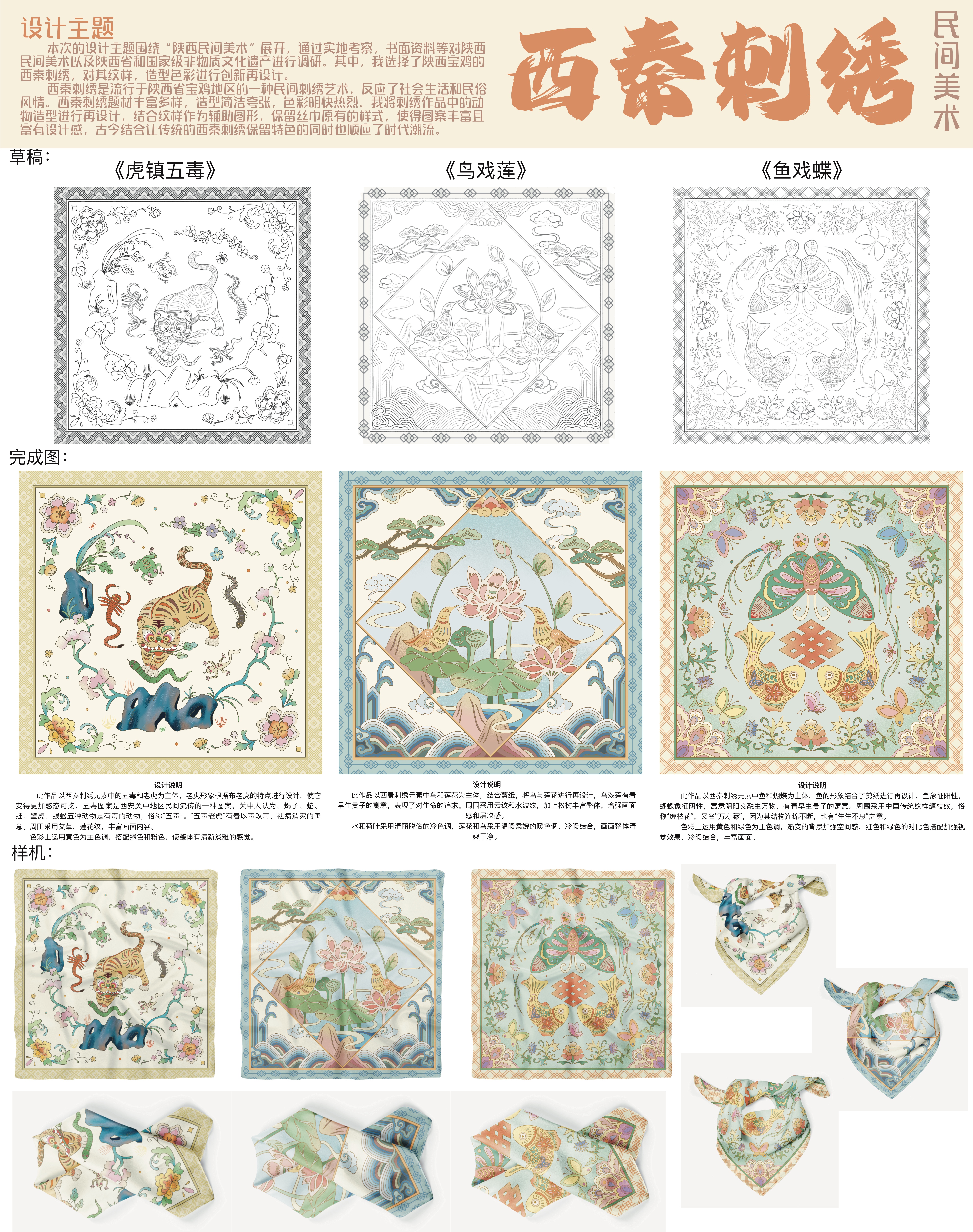 通过实地考察,书面资料等对陕西民间美术以及陕西省和国家级非物质文化遗产进行调研。其中,我选择陕西宝鸡的西秦刺绣,对其纹样,造型色彩进行创新再设计。西秦刺绣是流行于陕西省宝鸡地区的一种民间刺绣艺术,题材丰富多样,造型简洁夸张,色彩明快热烈。我将刺绣作品中的动物造型进行再设计,结合纹样作为辅助图形,保留丝巾原有的样式,使得图案丰富且富有设计感,古今结合让传统的西秦刺绣保留特色的同时也顺应了时代潮流。