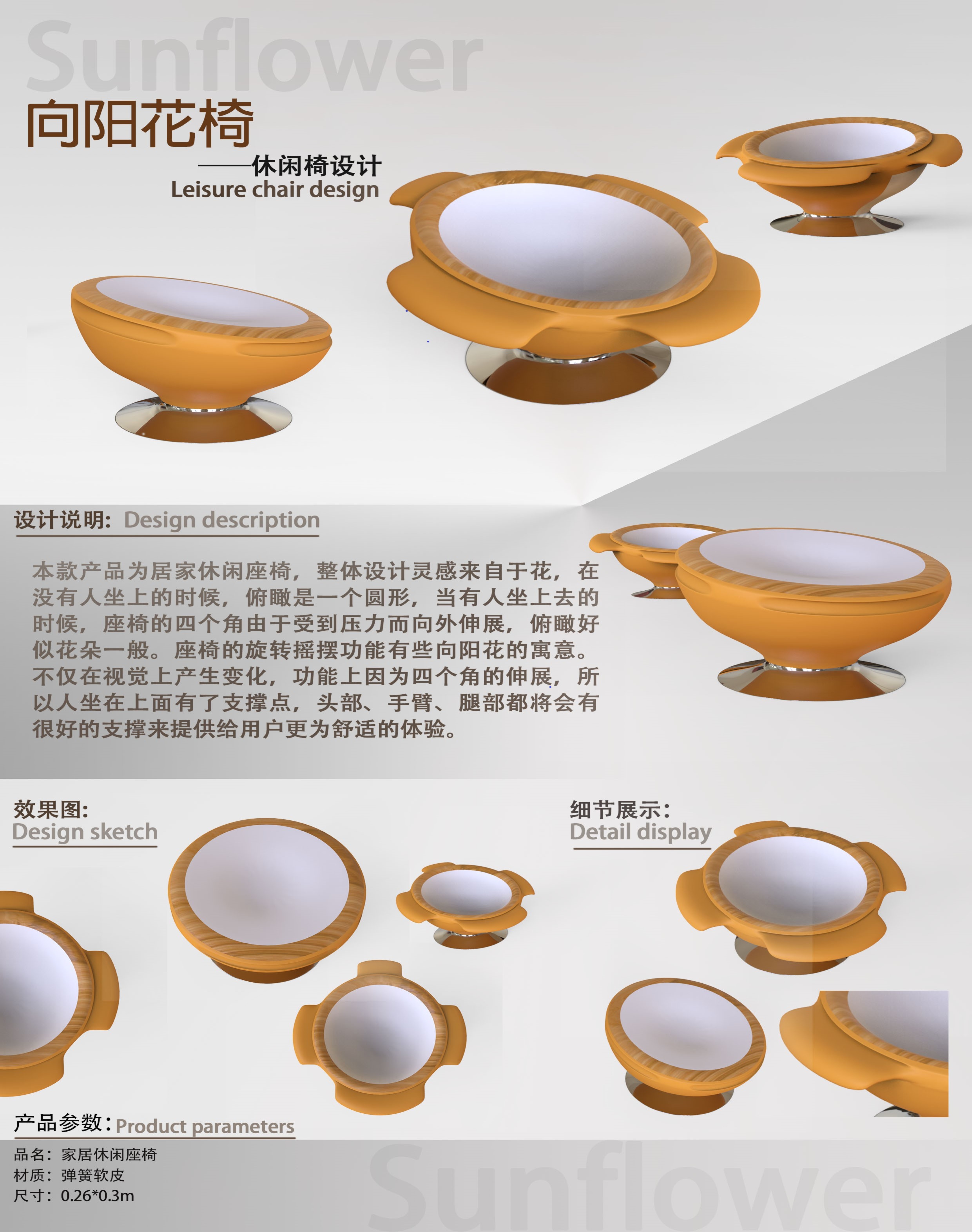 本款产品为居家休闲座椅,整体设计灵感来自于花,在没有人坐上的时候,俯瞰是一个圆形,当有人坐上去的时候,座椅的四个角由于受到压力而向外伸展,俯瞰好似花朵一般。座椅的旋转摇摆功能有些向阳花的寓意。不仅在视觉上产生变化,功能上因为四个角的伸展,所以人坐在上面有了支撑点,头部、手臂、腿部都将会有很好的支撑来提供给用户更为舒适的体验。